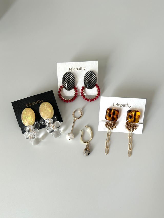 イヤリング3ペア・片耳イヤリング1個・イヤーカフ1個 通常価格→¥5500前後になります。 全て込み込み、送料無料です。 ※当店発行クーポン、利用不可 大変お買い得なセットになります。 ・オーロライエローカボションイヤリング (約50mm) ・ドット×赤2wayイヤリングイヤリング (約42mm ・べっ甲カラーイヤリング (約65mm) ・コットンパール片耳フープイヤリング (約47mm) ・天然石イヤーカフ (約40mm) ▪︎ネジバネ式、シリコンカバー付き 素材 合金、アクリル、ガラス、コットンパール、天然石(ダルメシアンジャスパー) ヴィンテージライク 大人イヤリング ハッピーバッグ 福袋