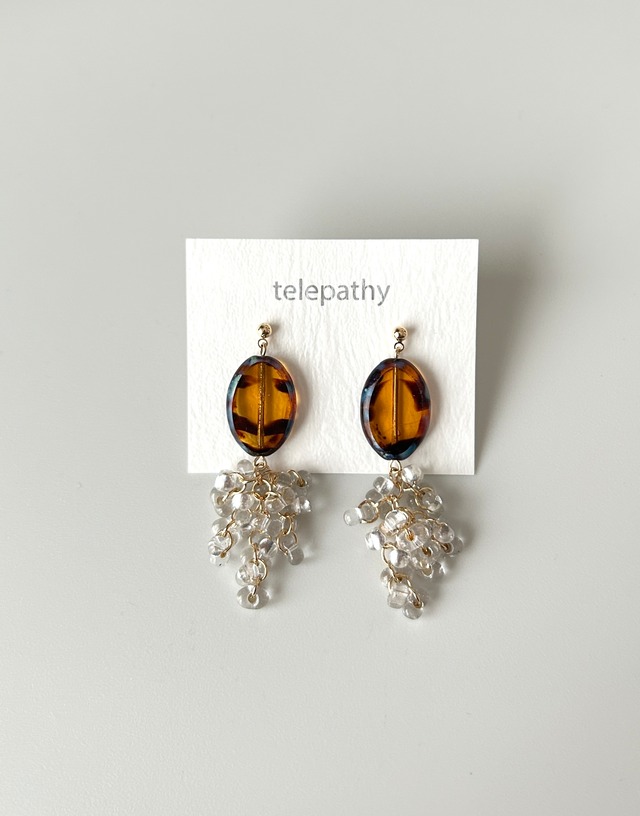 べっ甲カラーチェコビーズ×クリア、2種のチェコビーズを使用した、綺麗めコーデにもぴったりな大人ピアスです。 ▪︎イヤリング変更→別途+100円になります。 サイズ 約60mm 素材 合金、ガラス チェコビーズ べっ甲 クリア 大人ピアス