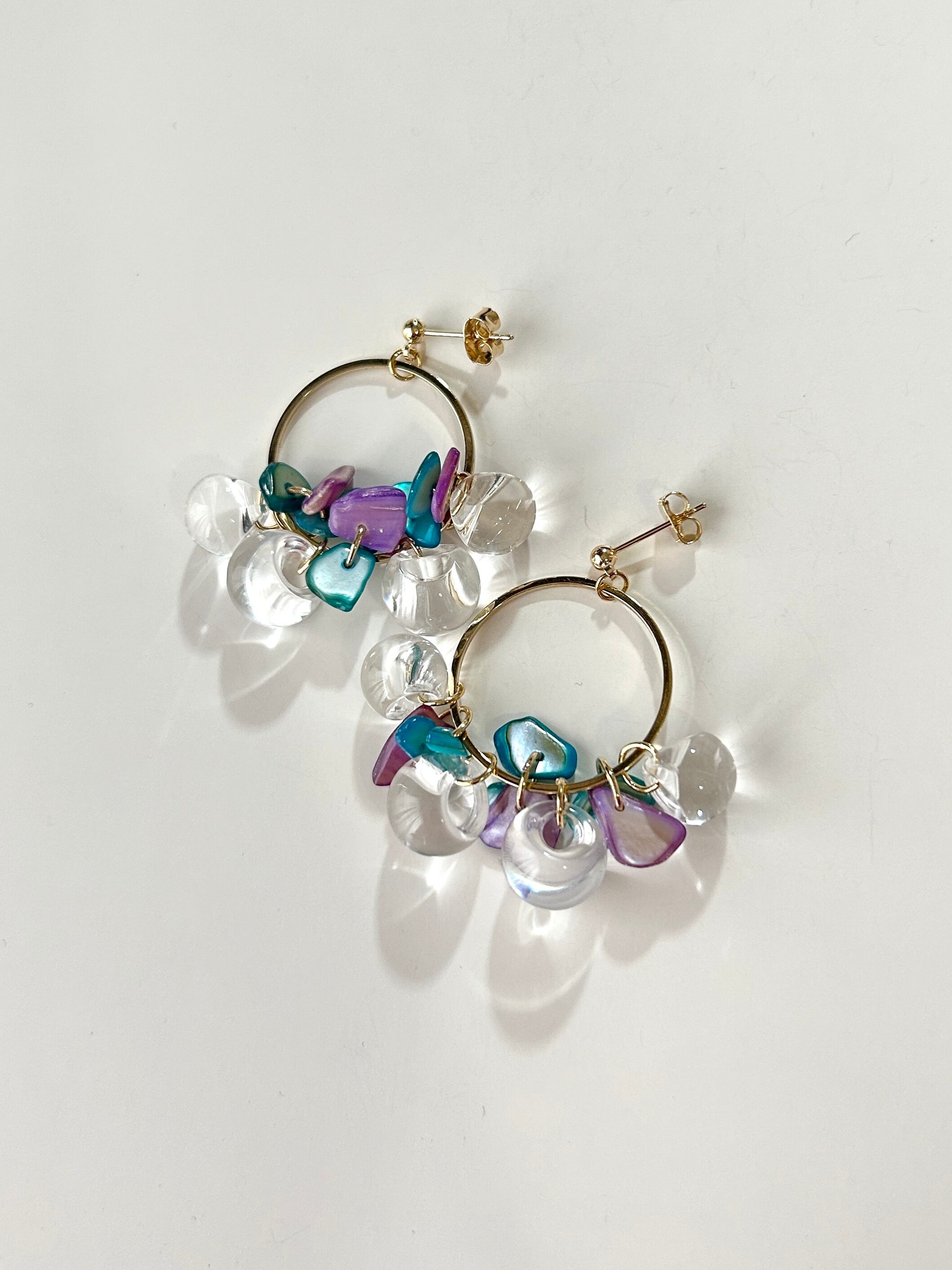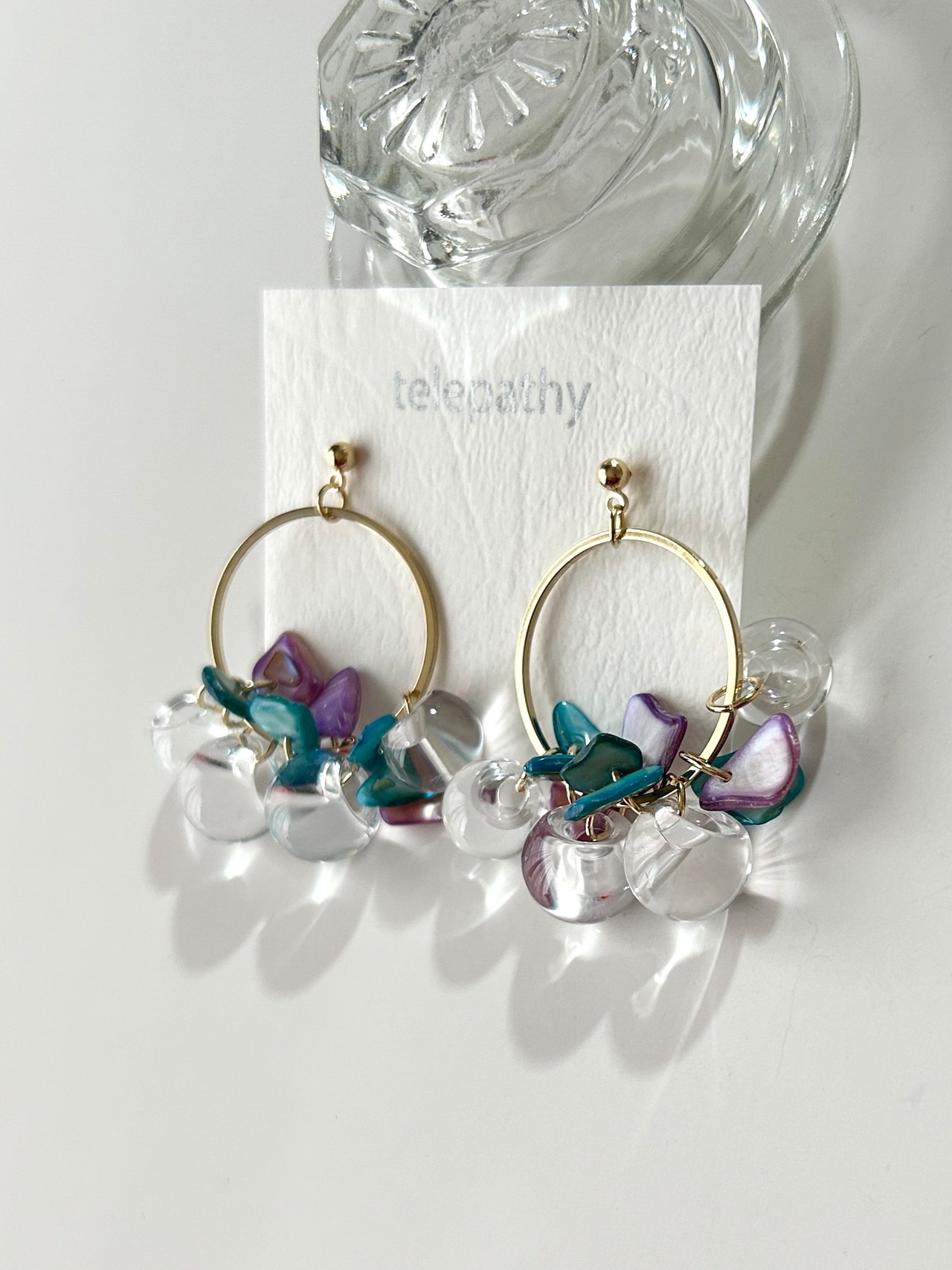 ブルー・パープル系カラーシェルとクリアビーズを合わせた、着けると可愛い大ぶりピアスです。