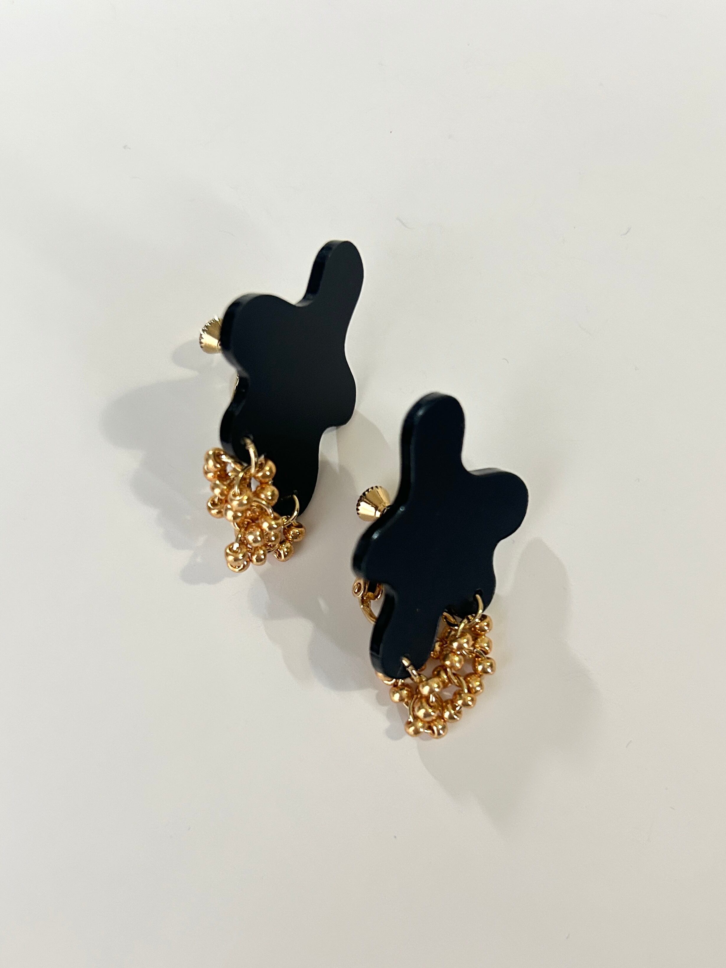 変形ブラックアクリルを加工し、ゴールドガラスビーズと合わせました。