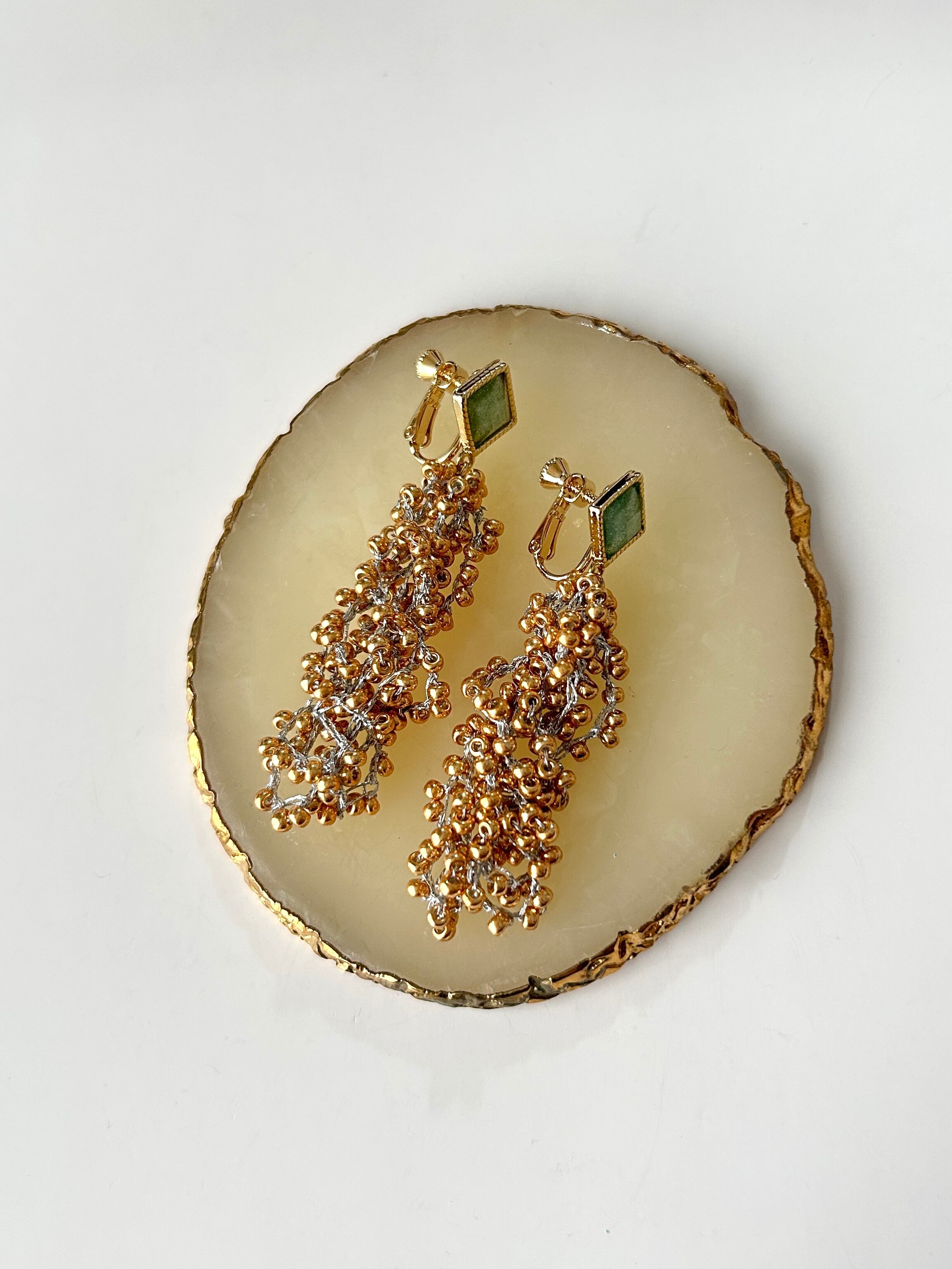 小ぶりなライトグリーンのスクエアカボションに、ひと針ひと針編み上げたビーズ刺繍タッセルを合わせた、繊細さが素敵な大人イヤリングです。