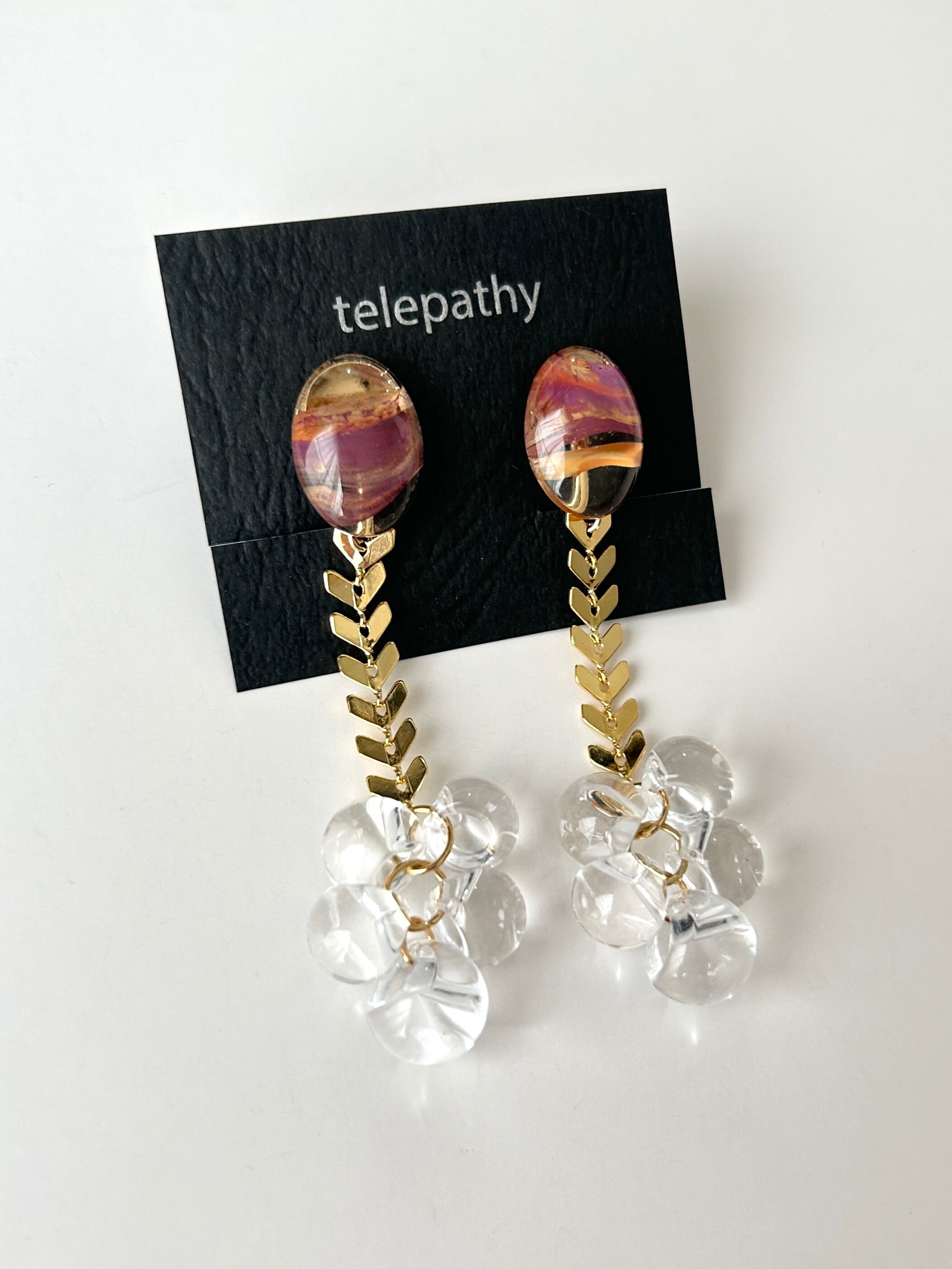 素敵な雰囲気のガラスカボションに、デザインチェーンとクリアビーズを合わせた、個性派デザインがかっこいい大人イヤリングです。