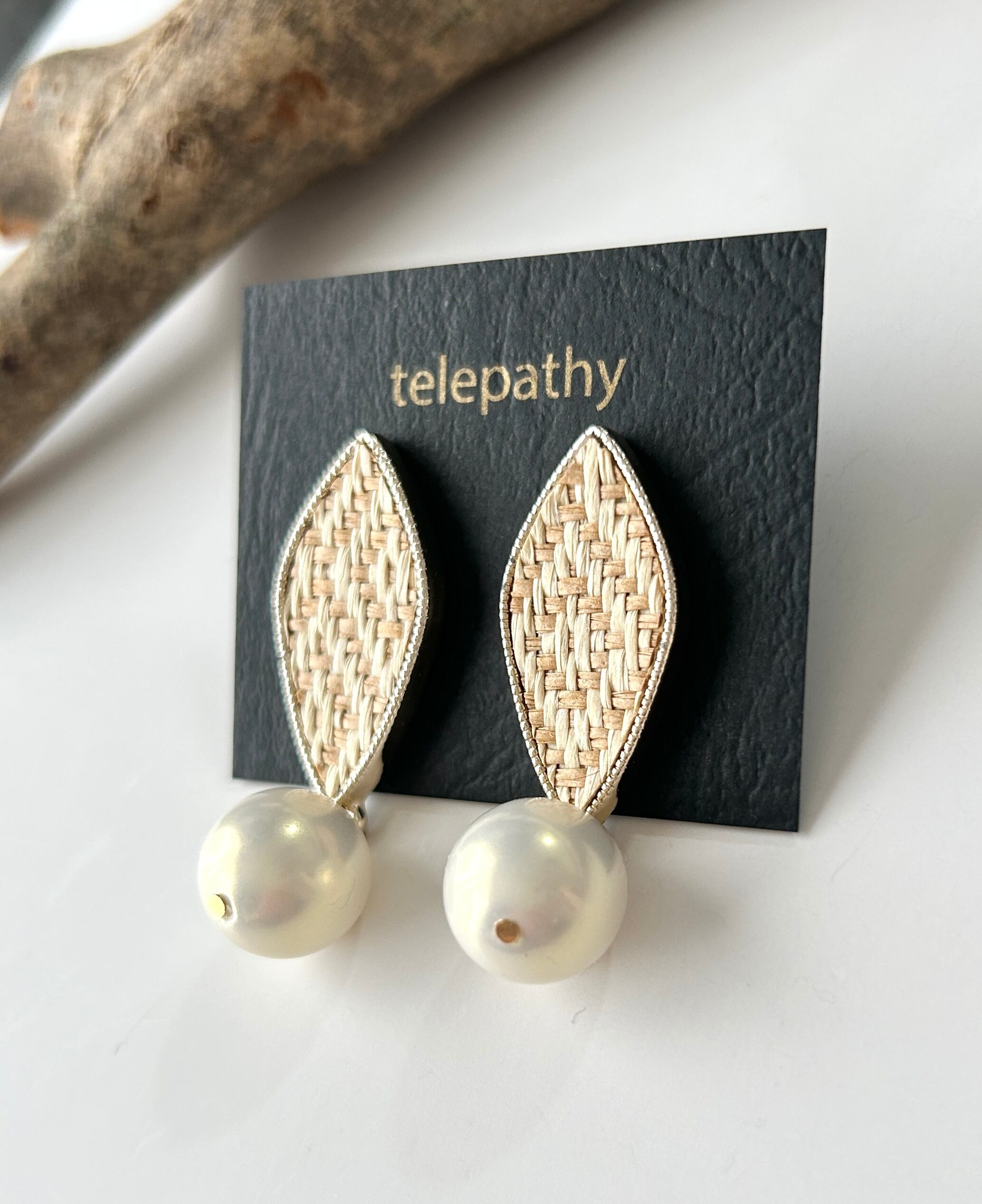 リネンを編み込んだ夏らしい模様のカボションに、シルキーパールを合わせた、異素材mixが可愛い大人ピアスです。