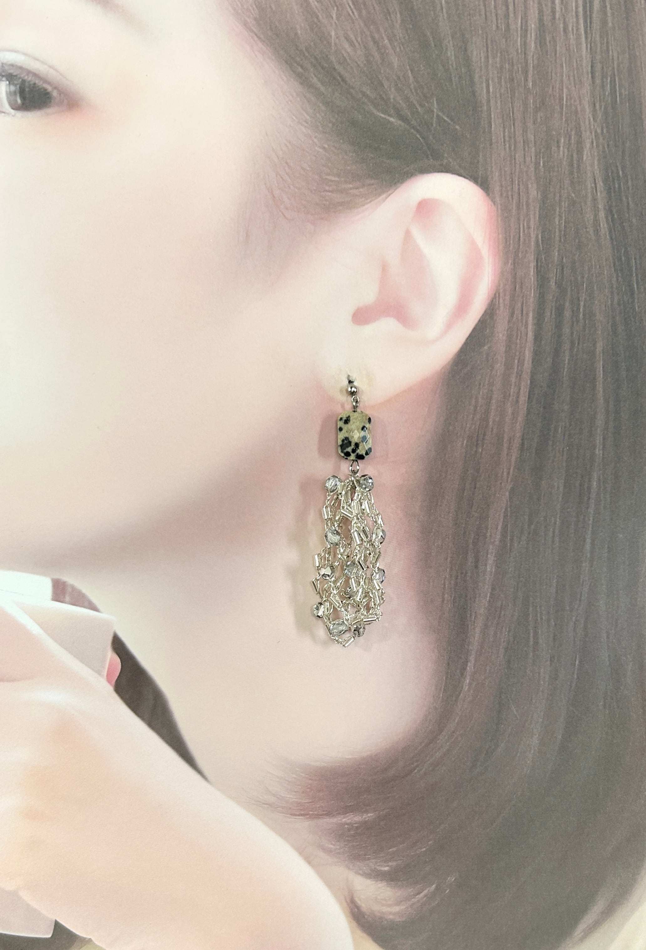 ダルメシアンジャスパー(天然石)×ビーズ刺繍タッセルピアス