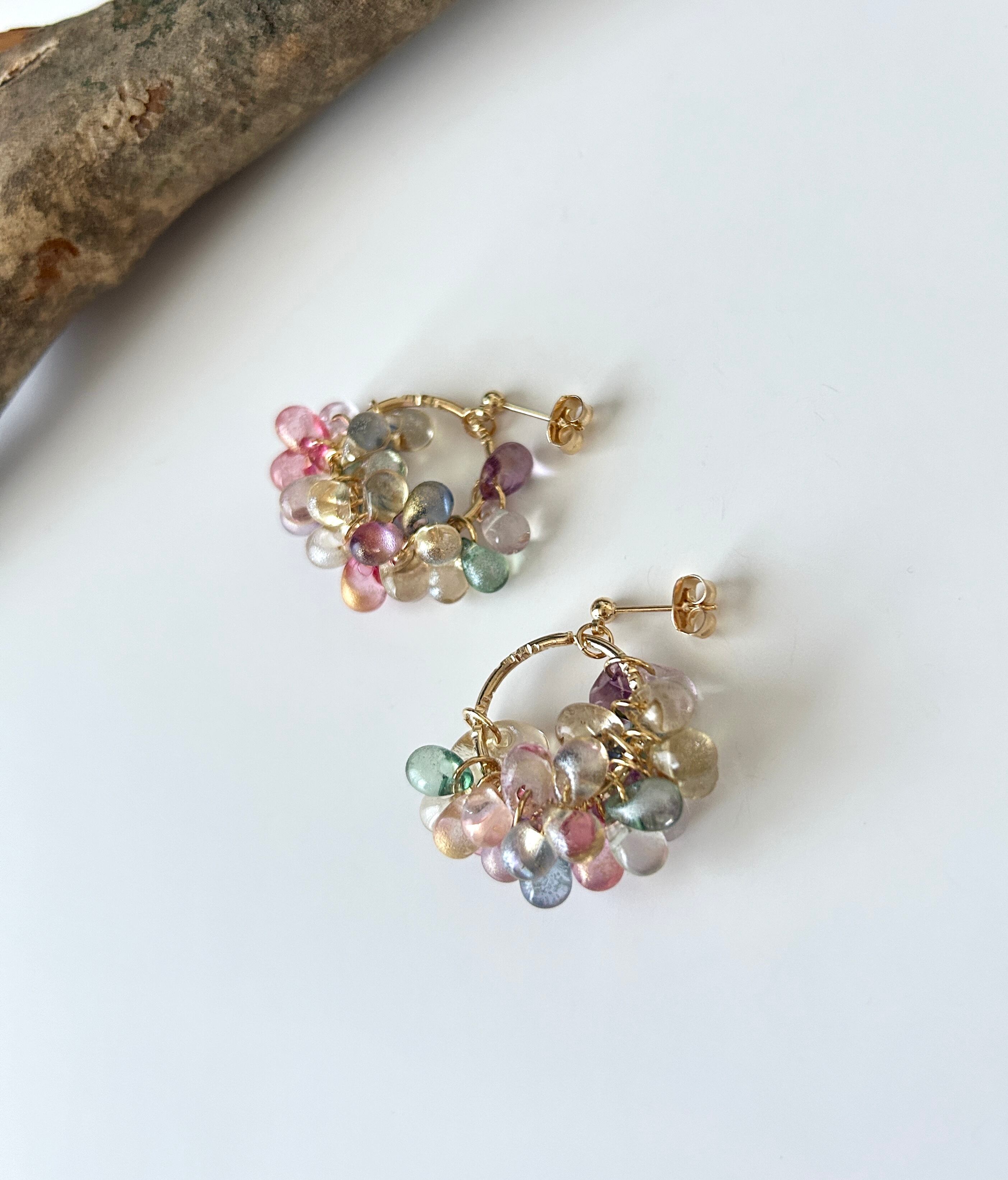 雫ビーズをランダムに組み合わせた、マルチカラーが可愛い程よいボリュームのピアスです。