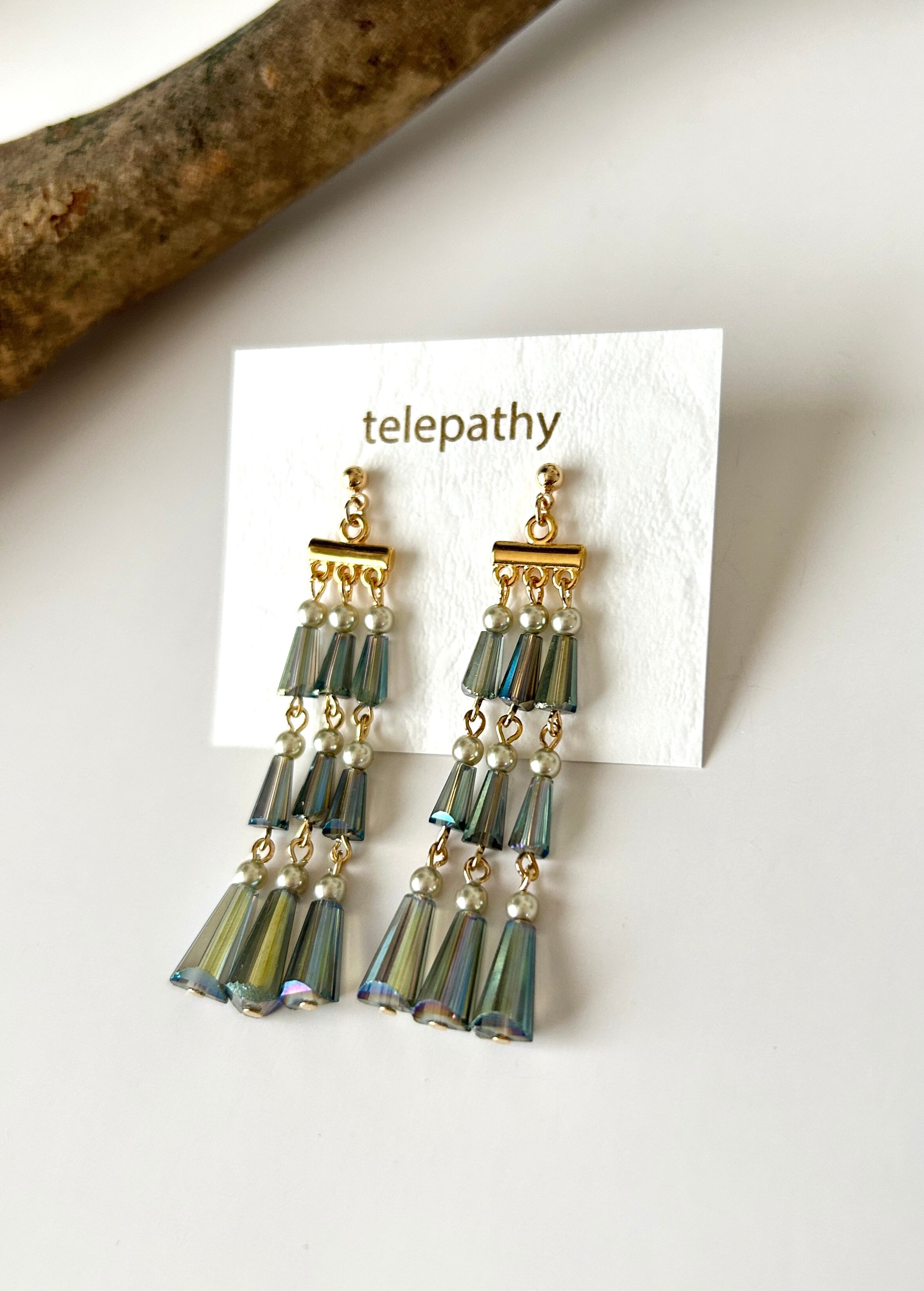 ブルーグリーンのガラスタワービーズがシャラシャラ綺麗な、艶のある大人ピアスです。
