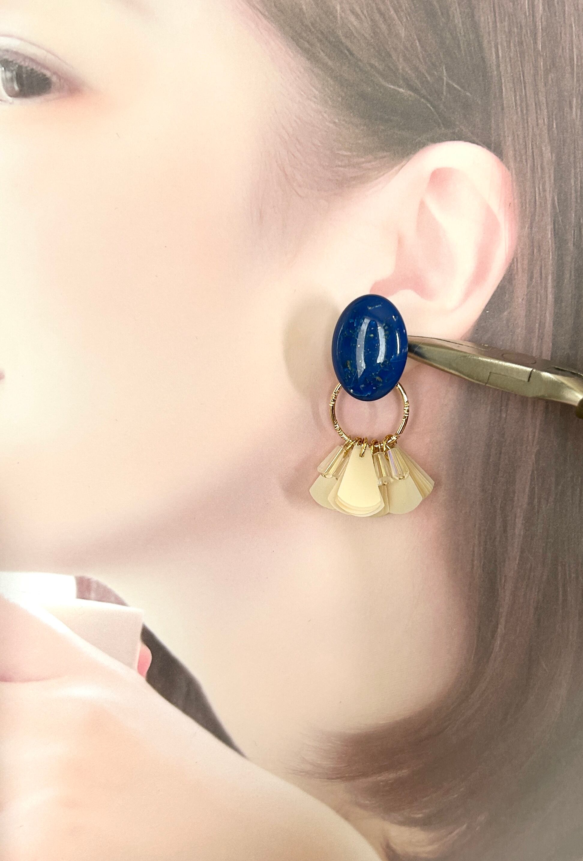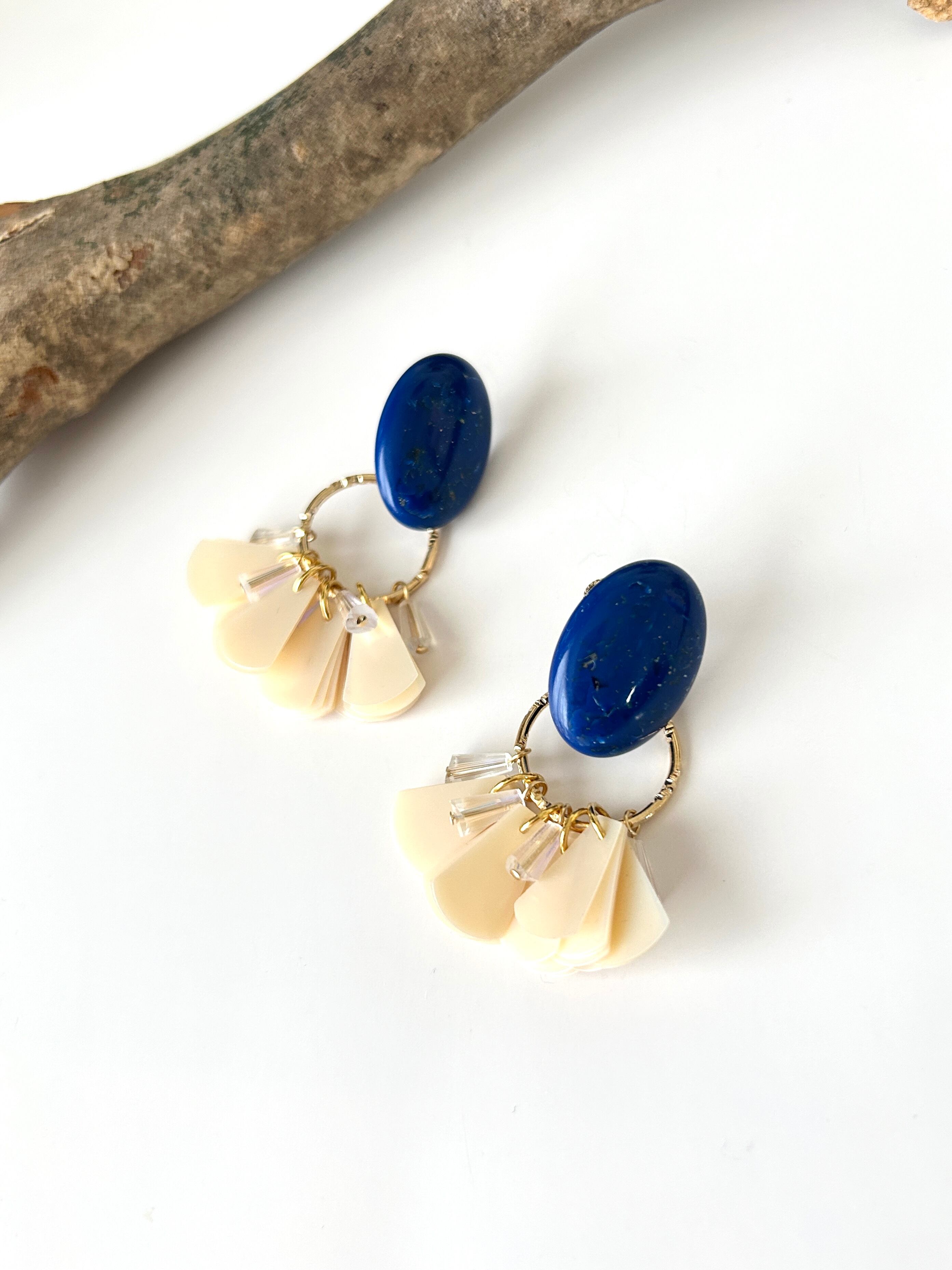 ブルーのvintageカボションに、アイボリースパンコール・クリアタワービーズを合わせた、耳元弾む2wayイヤリングです。