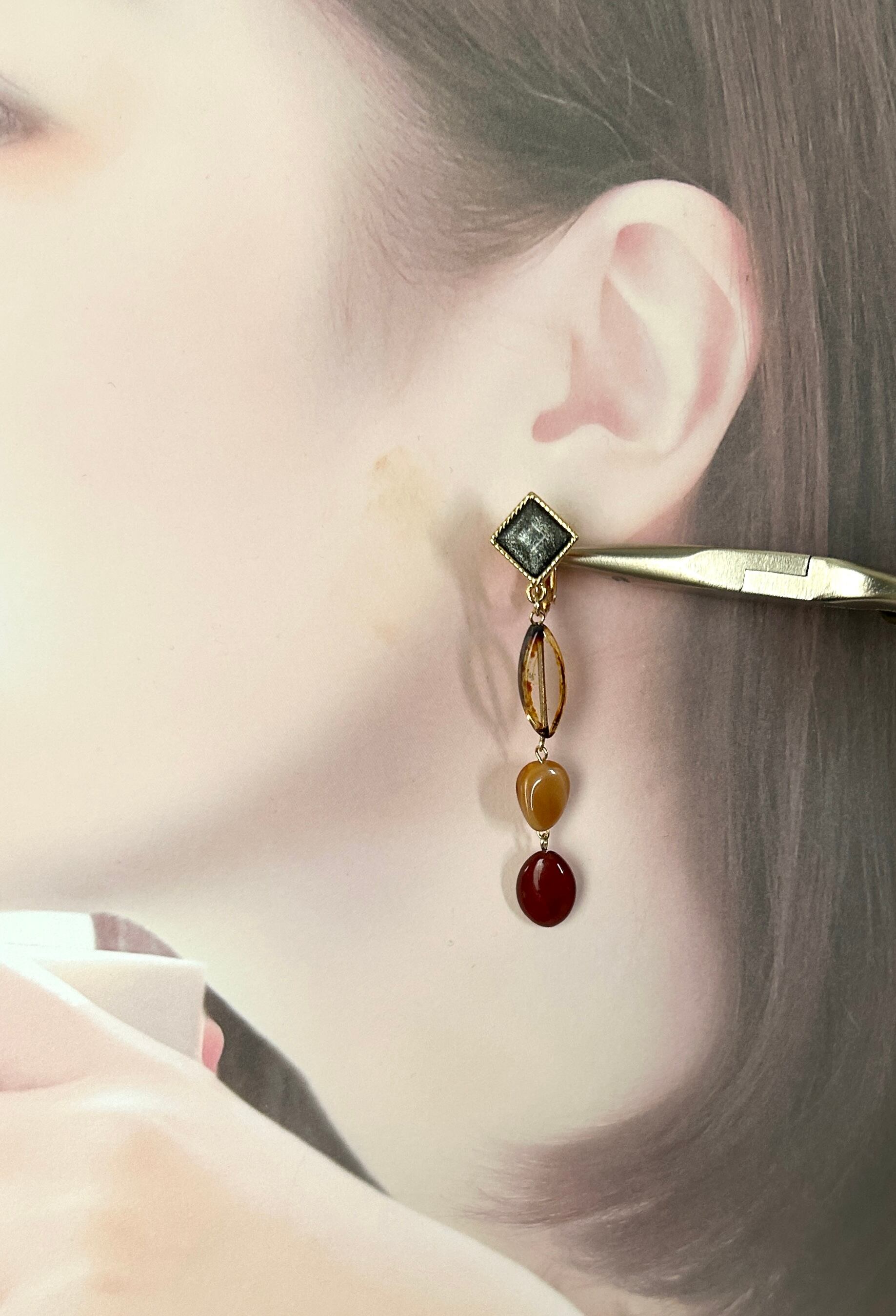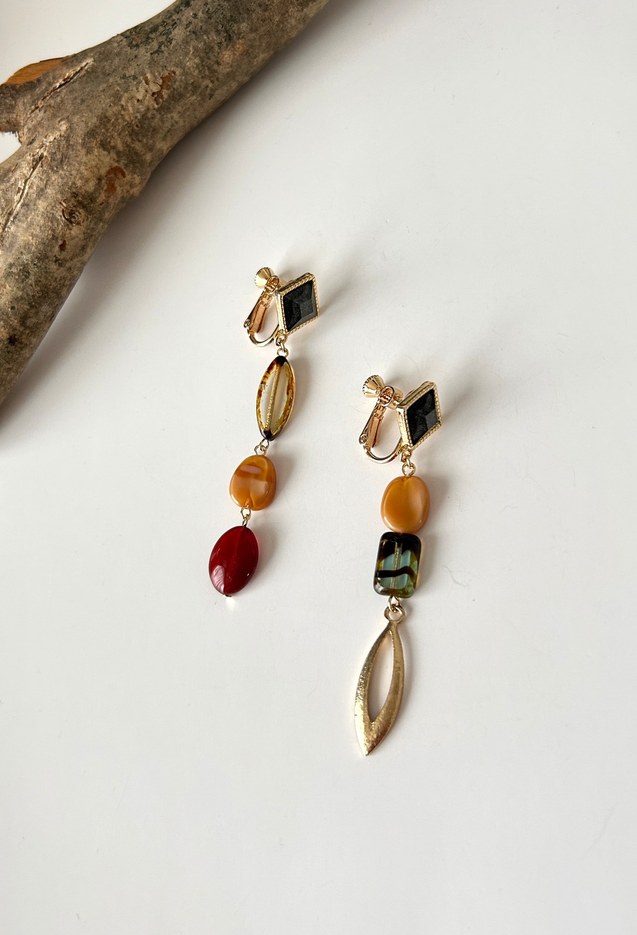 小ぶりなスクエアカボションに、チェコビーズや天然石を秋色でまとめた、アシンメトリーイヤリングです。