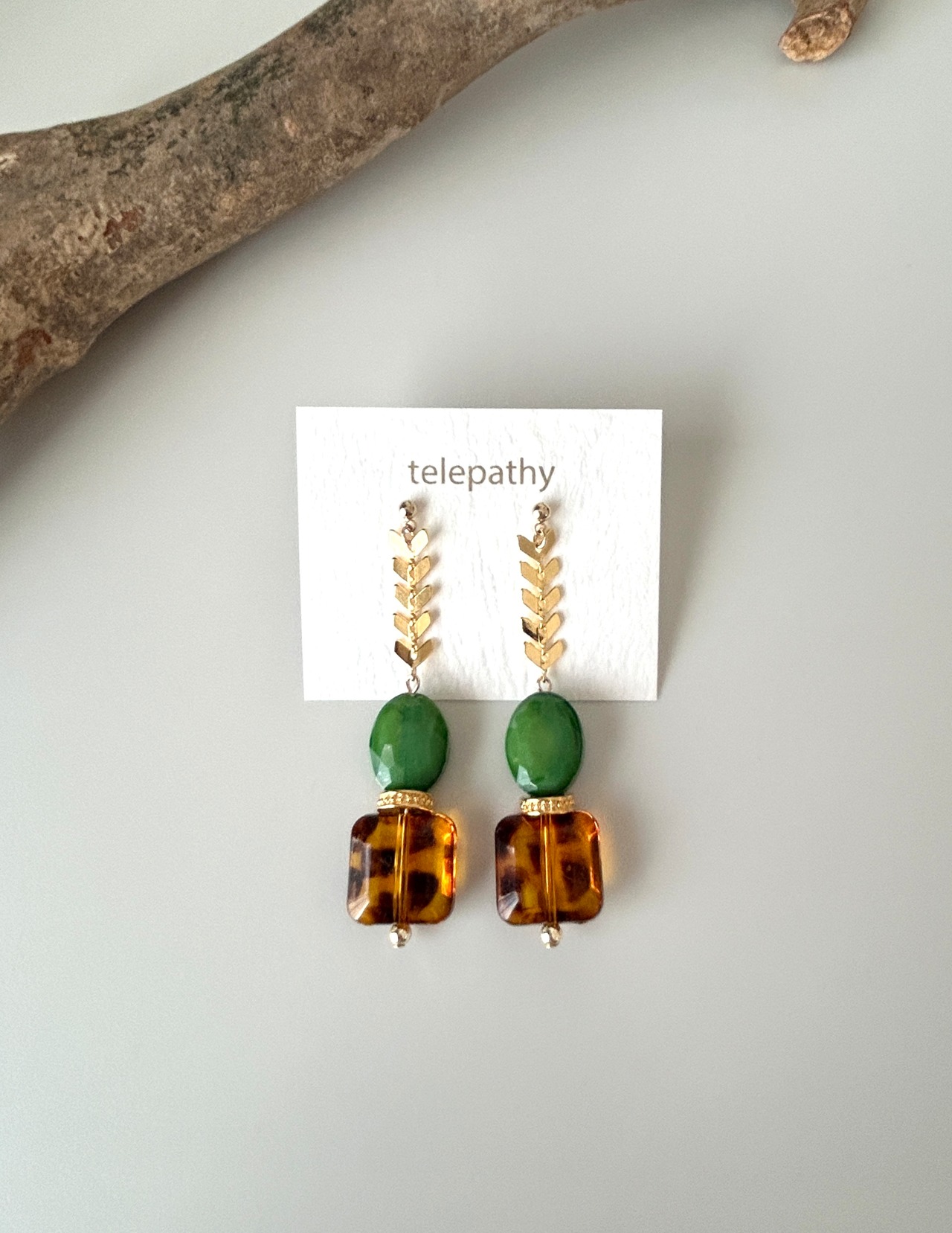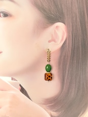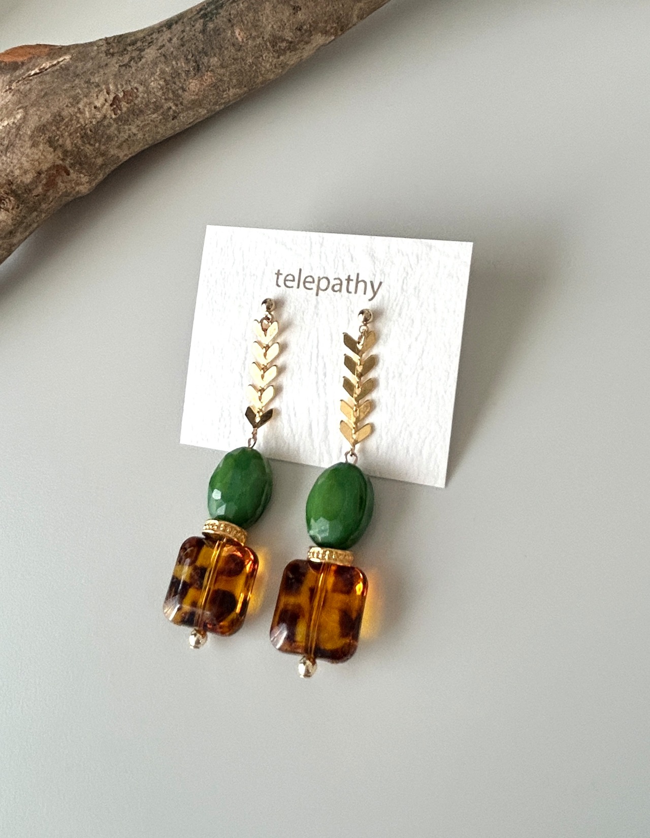 グリーンガラスビーズ・べっ甲カラーのレオパード柄アクリル×デザインチェーン。