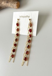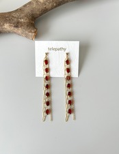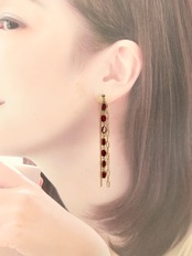 ゴールド縁取りの深紅ガラスビーズと、2種のチェーンが素敵に揺れるロングピアスです。