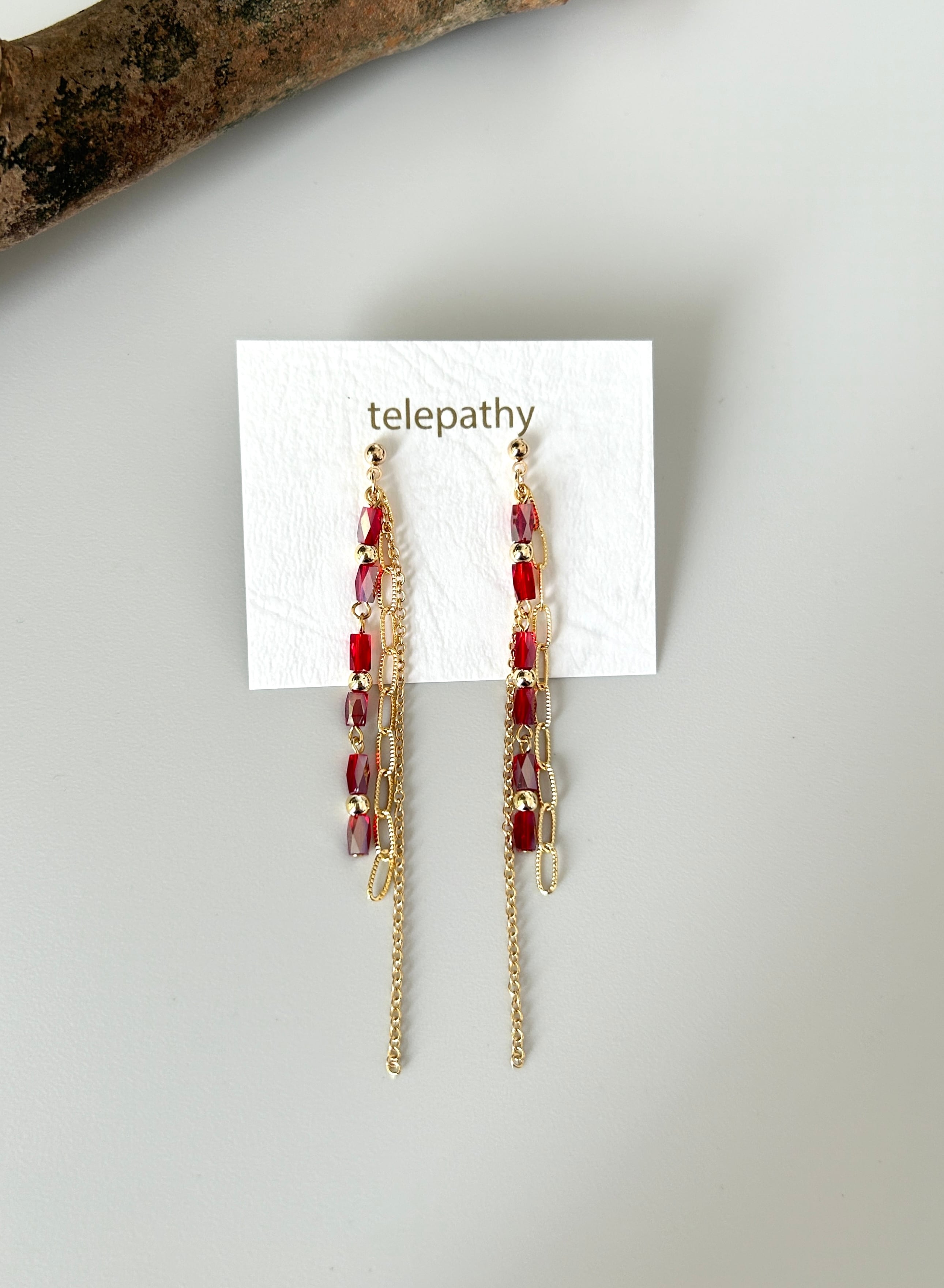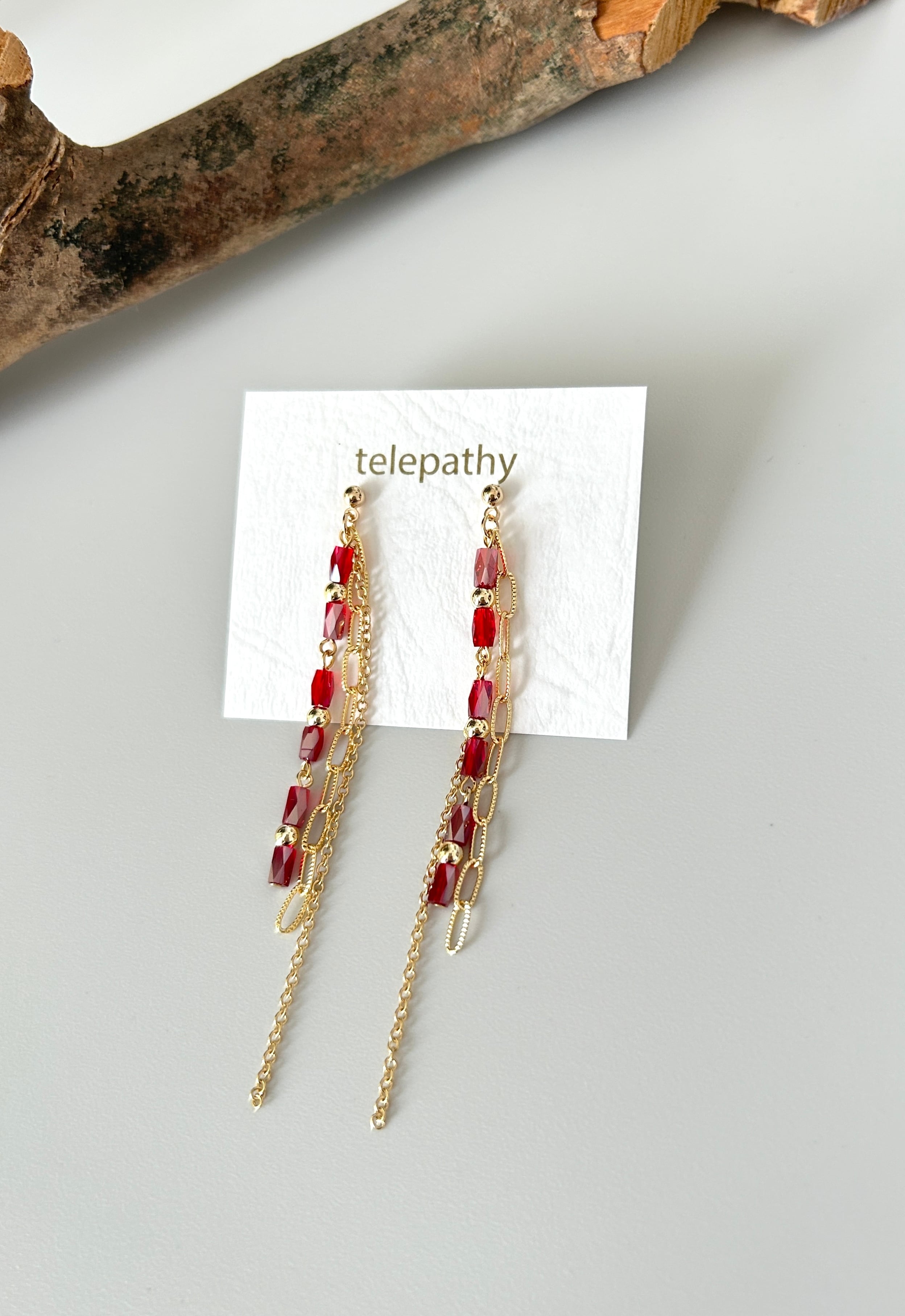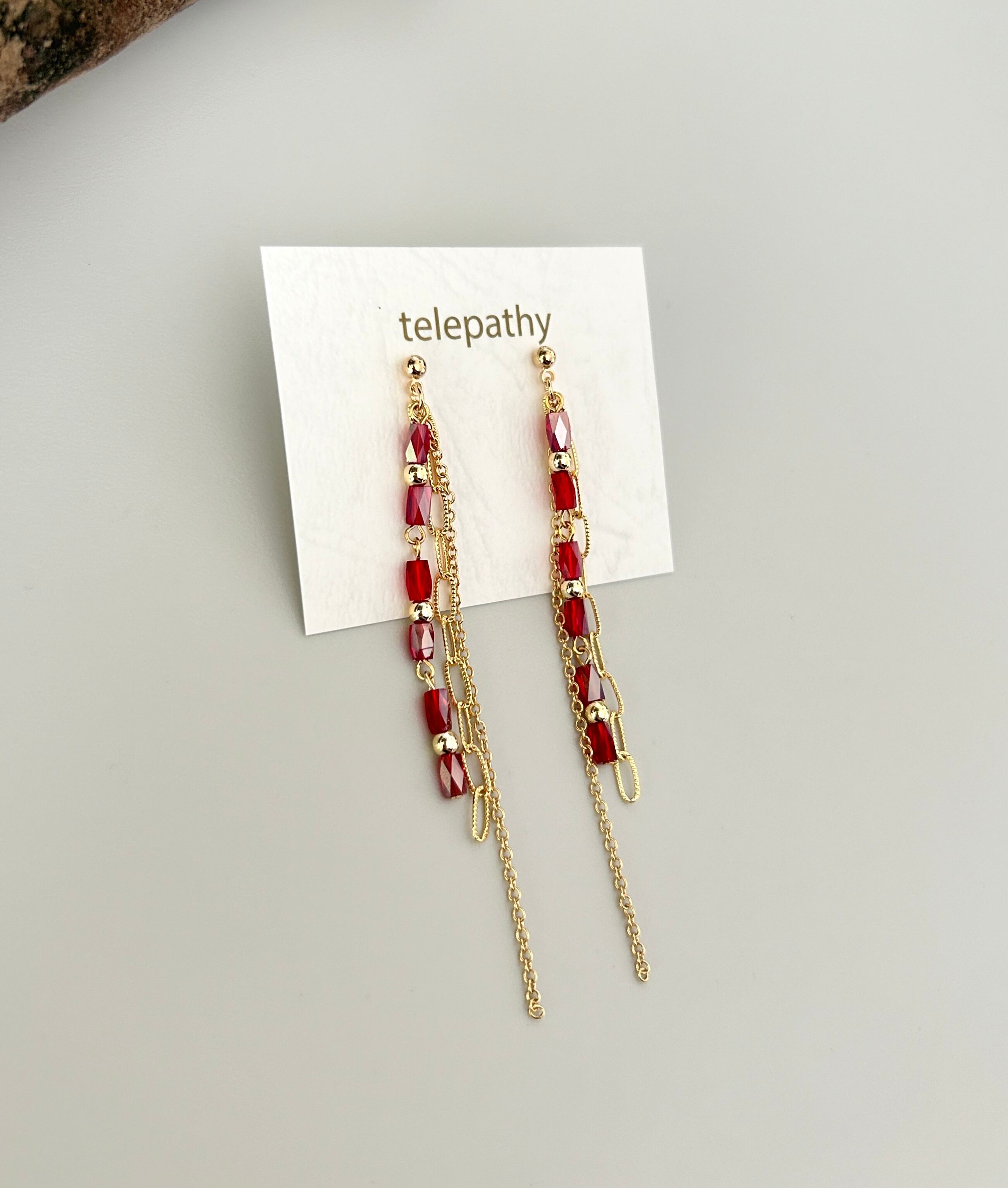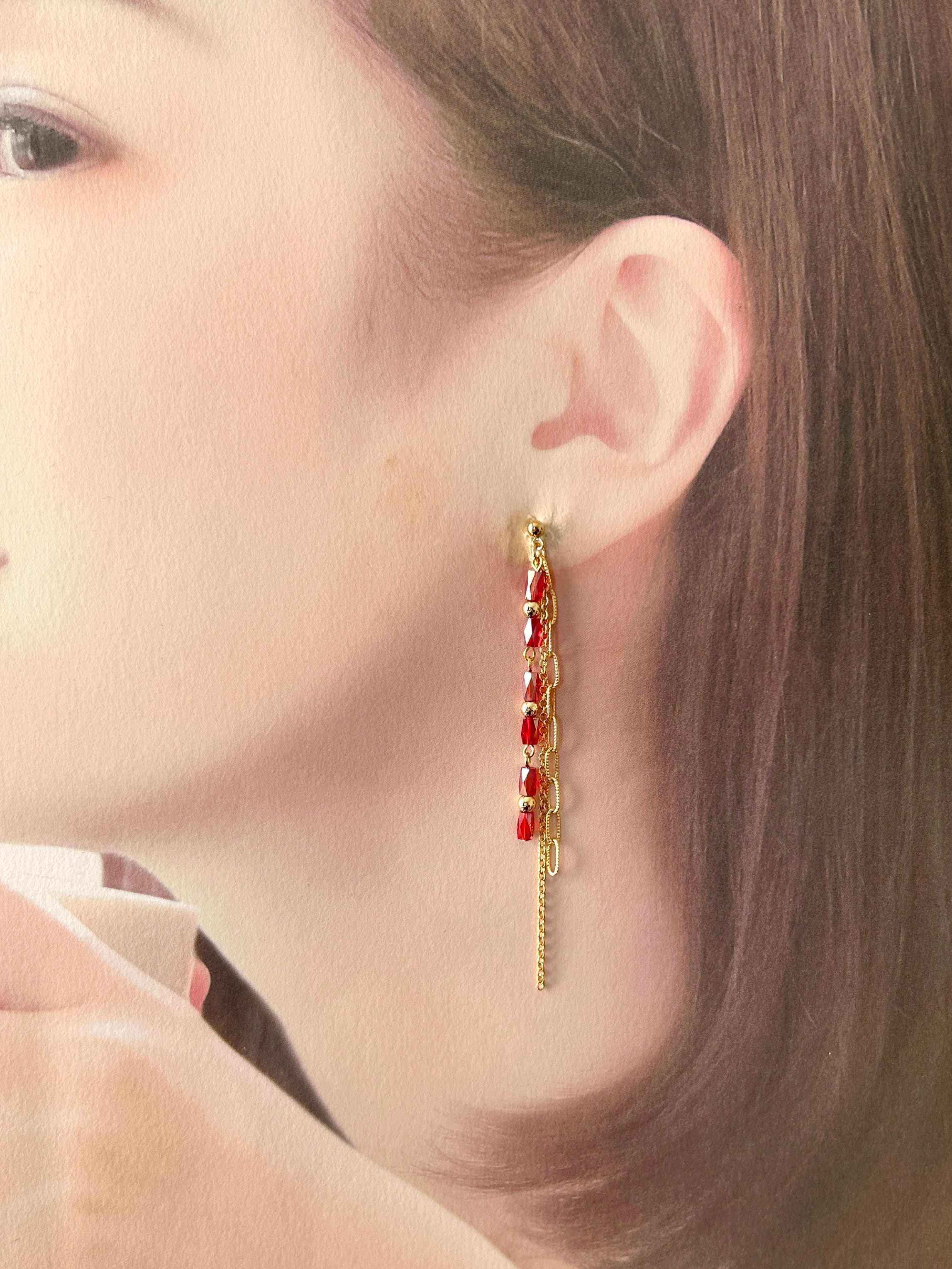 クリアレッドのガラスビーズをメインに、2種のチェーンを合わせました。