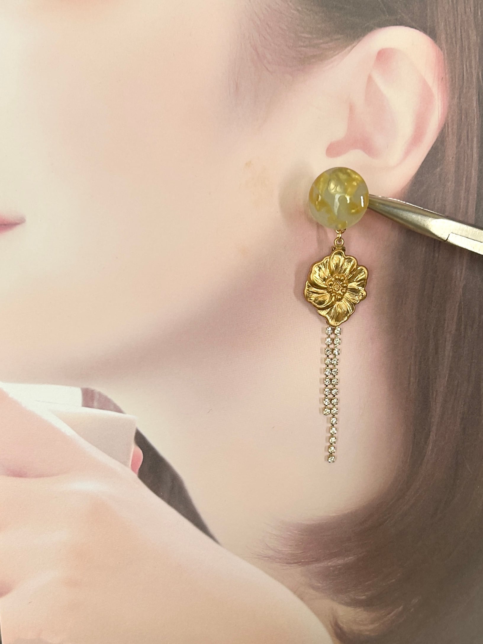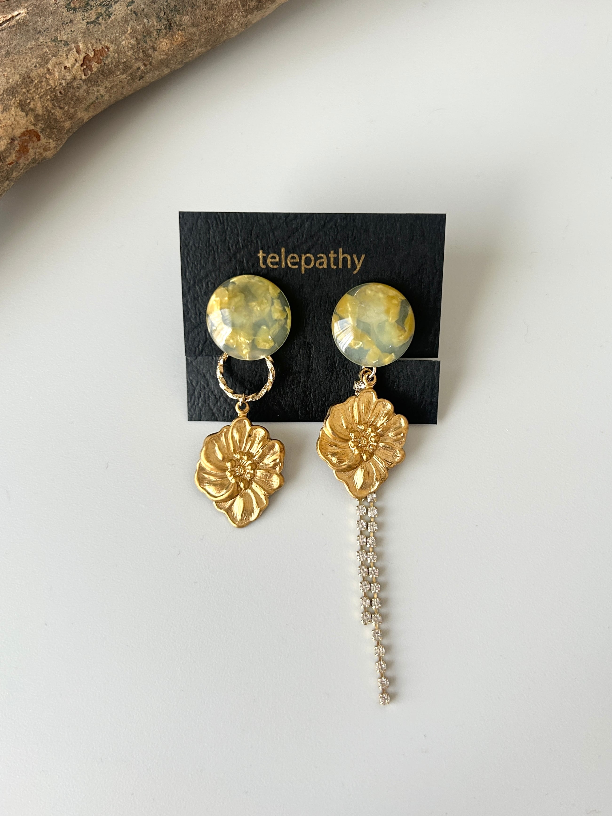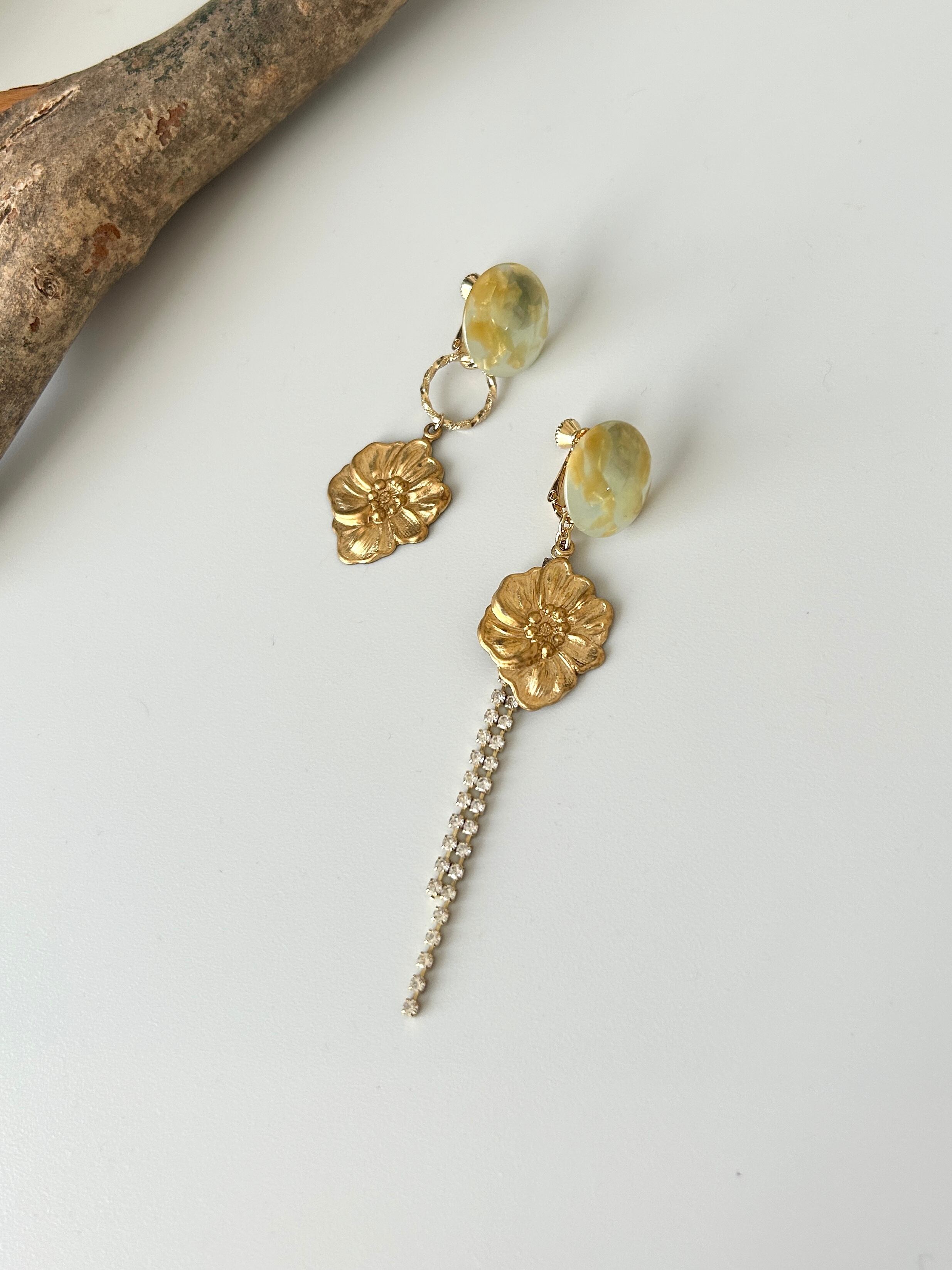 淡いマーブルカラーのアセチカボションに、USA真鍮フラワーを合わせたアシンメトリーイヤリングです。
