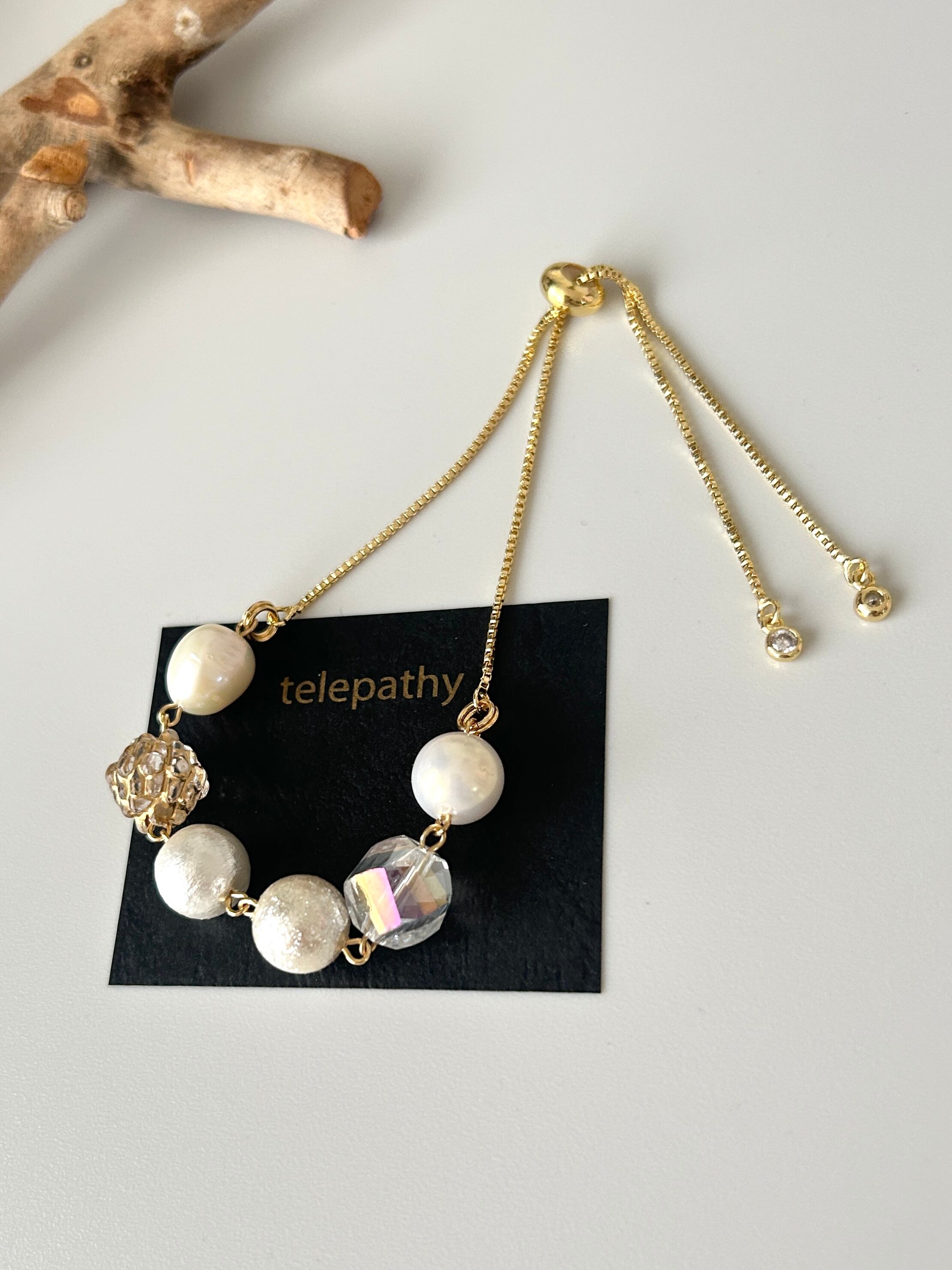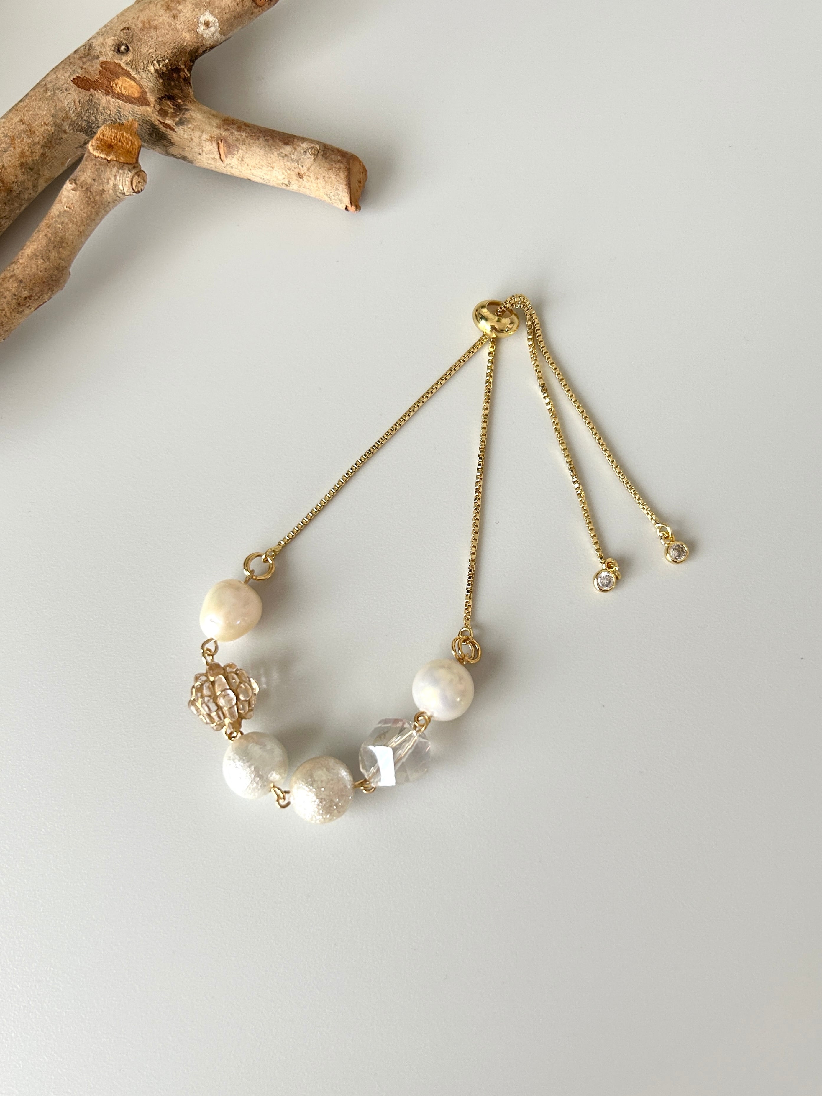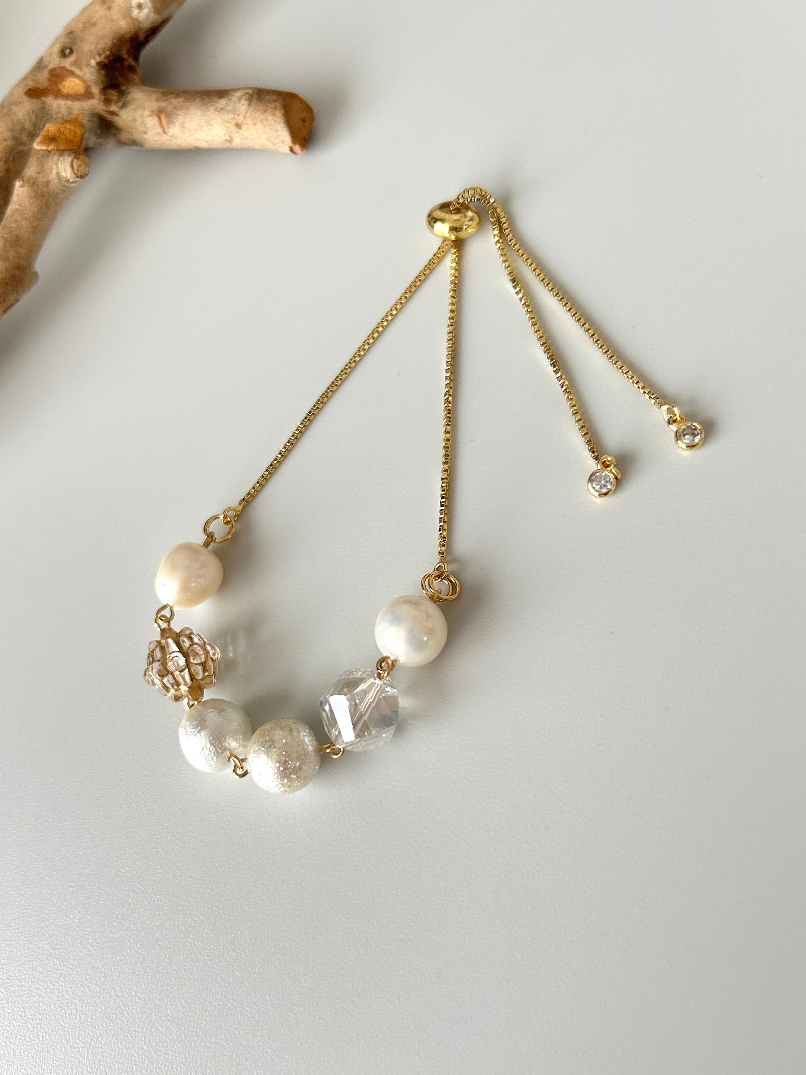 淡水パール、コットンパール、シャイニーパール、シルキーパール、ゴロゴロパーツが可愛いブレスレットです。