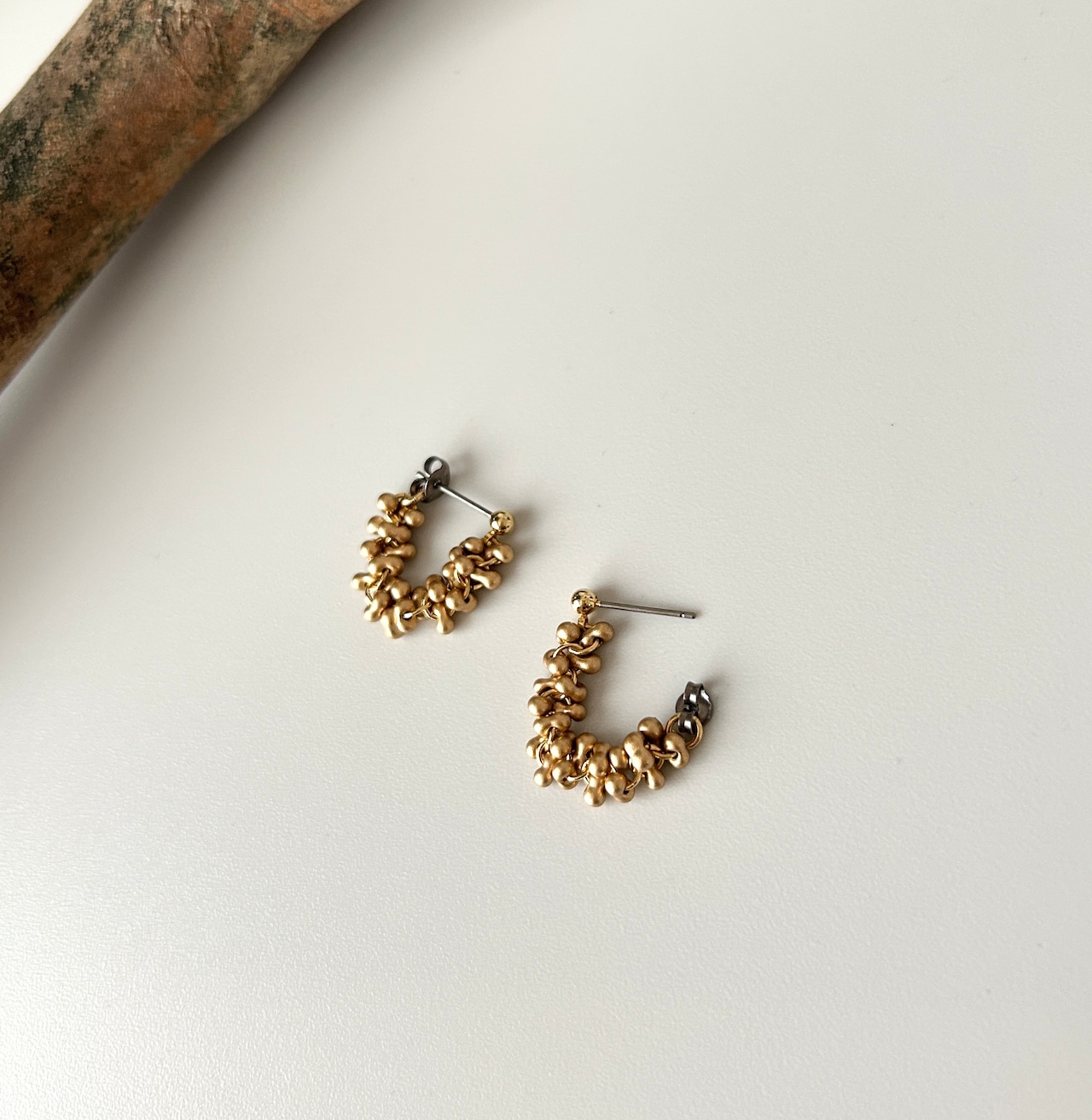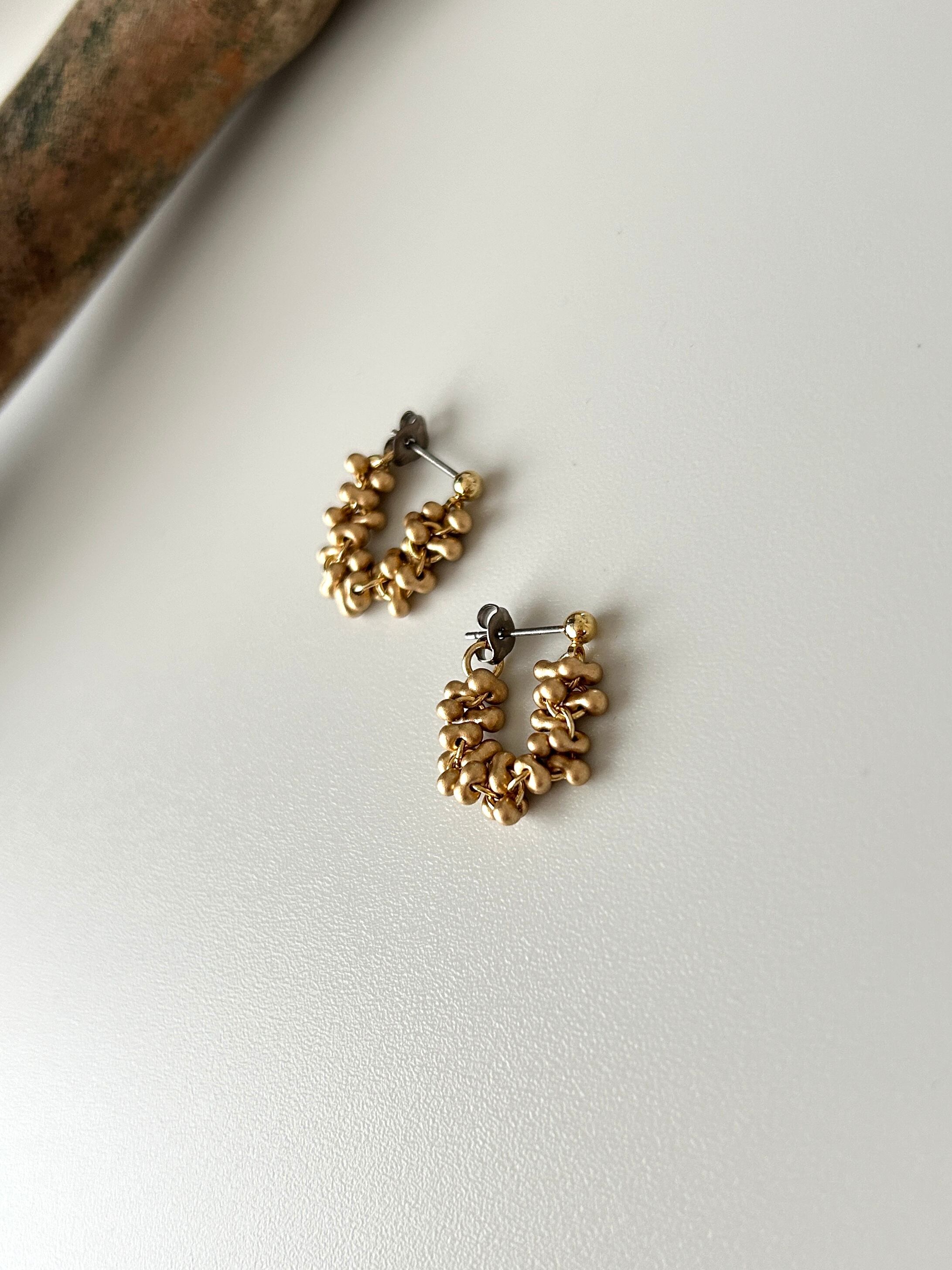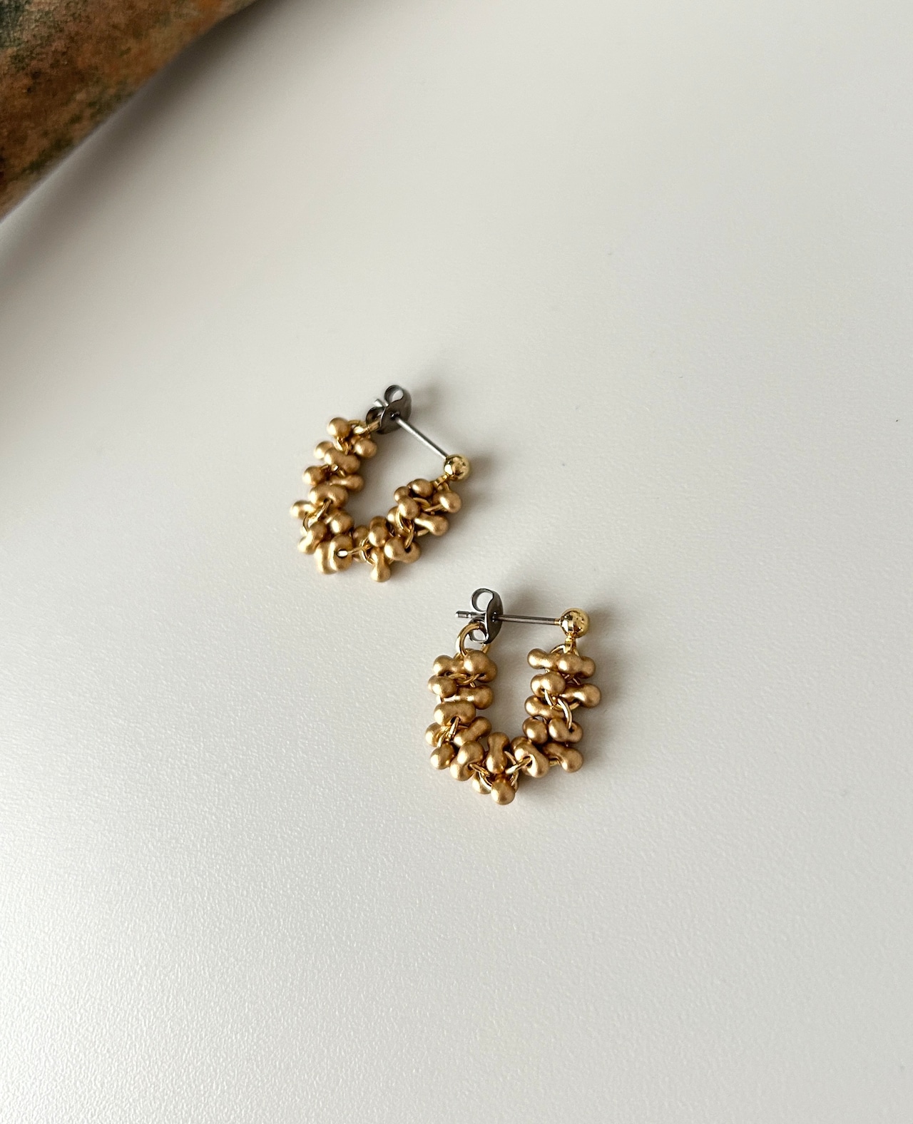 マットゴールドの極小チェコビーズファルファーレを使用した、繊細で大人なフープピアスです。