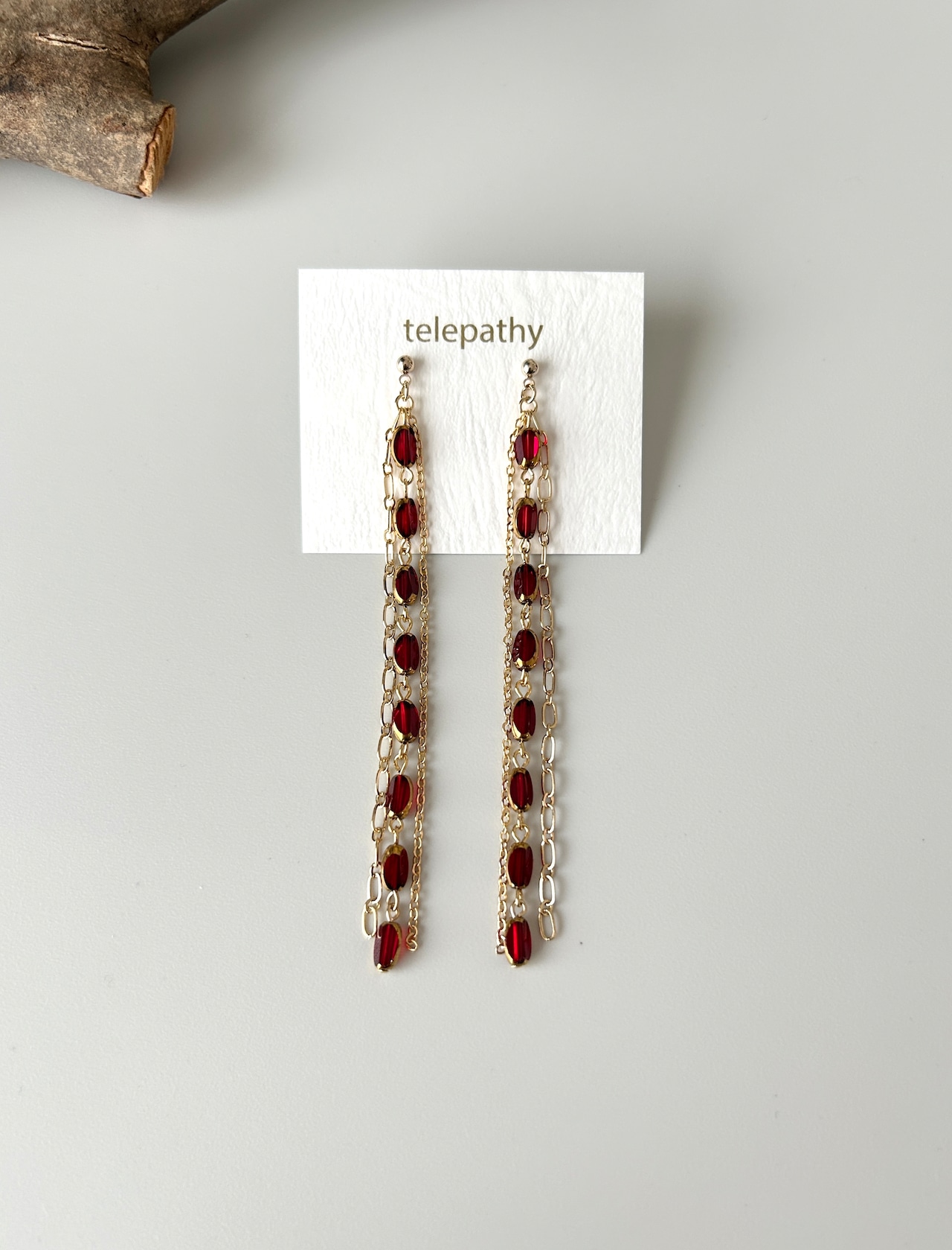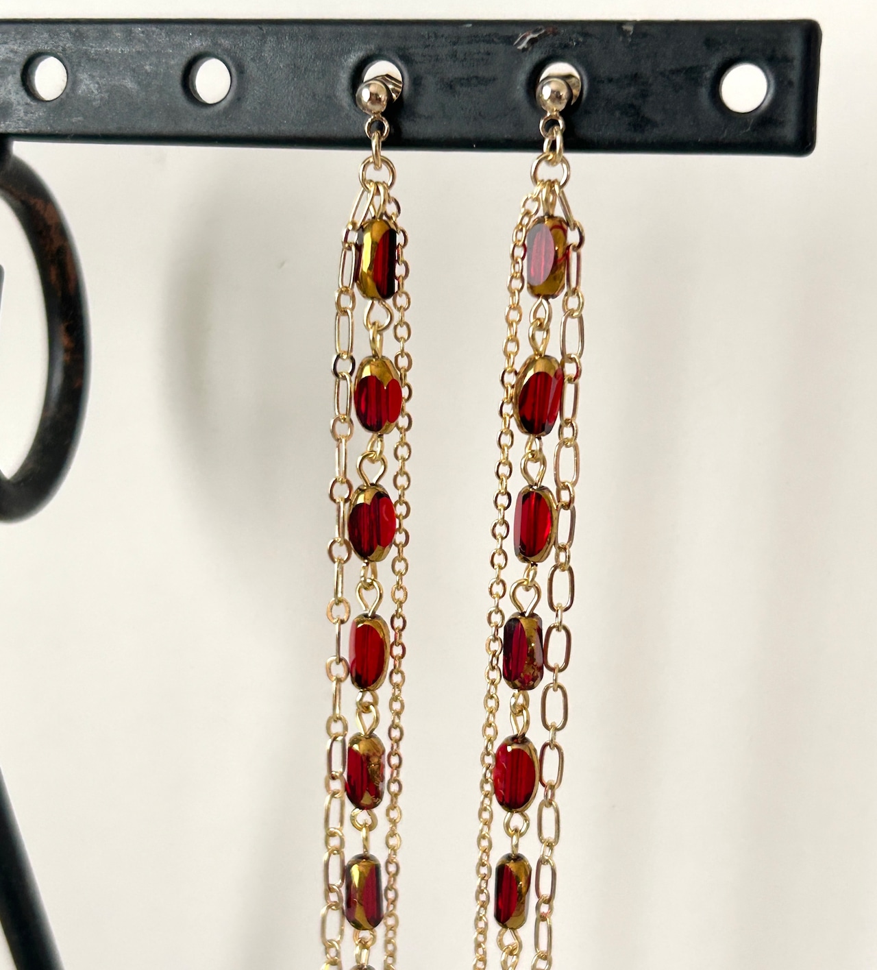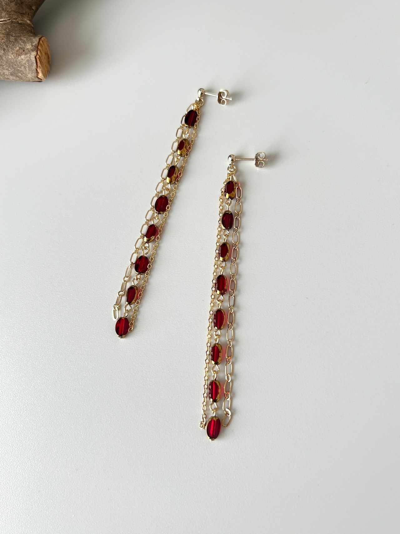 ゴールドフレームの深い赤のガラスビーズに、2種のチェーンを合わせました。