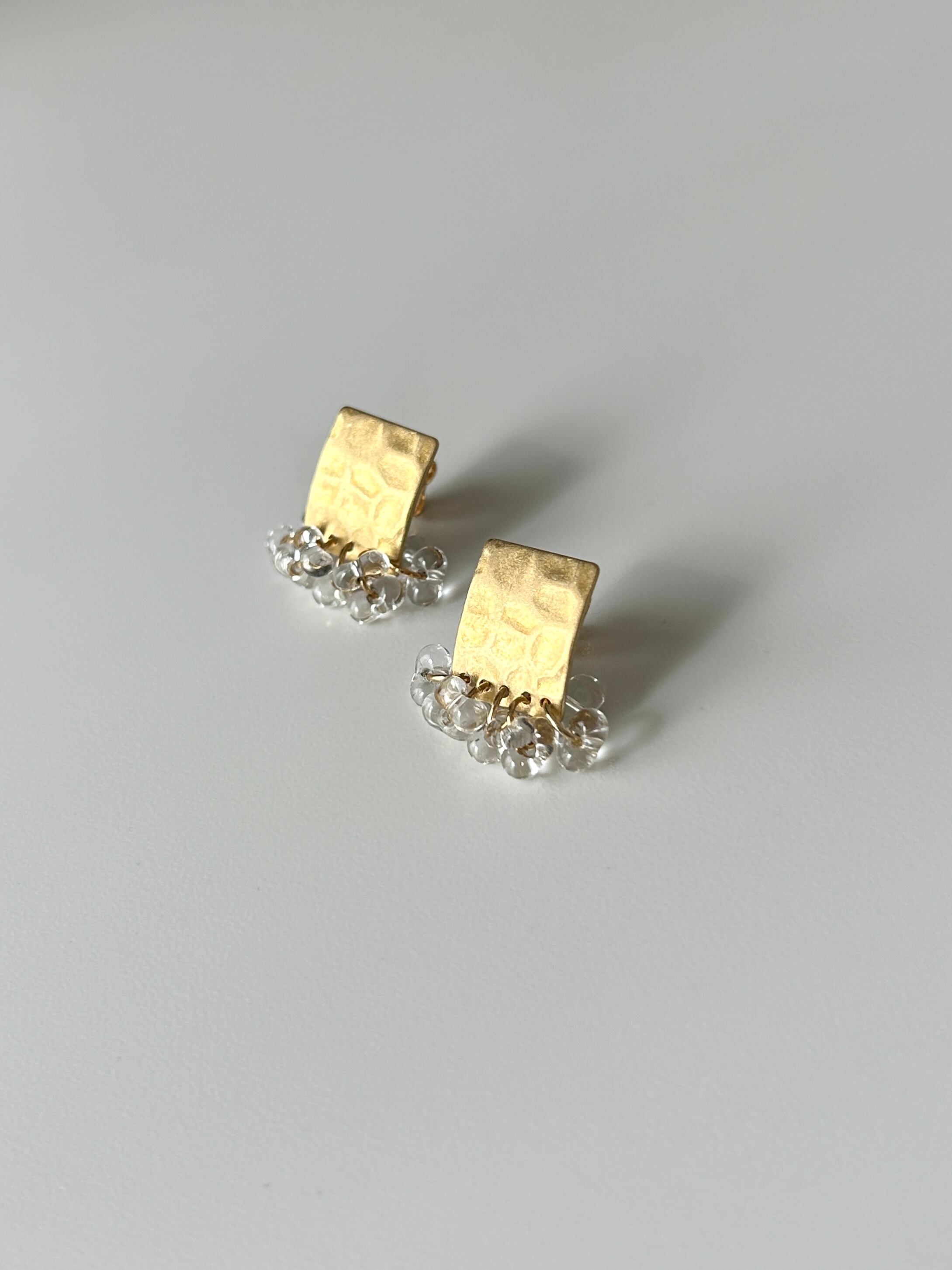 ほんのりカーブした、ハンマー加工の真鍮プレートにキラキラクリアチェコビーズを合わせた、デイリー使いにもぴったりな大人ピアスです。