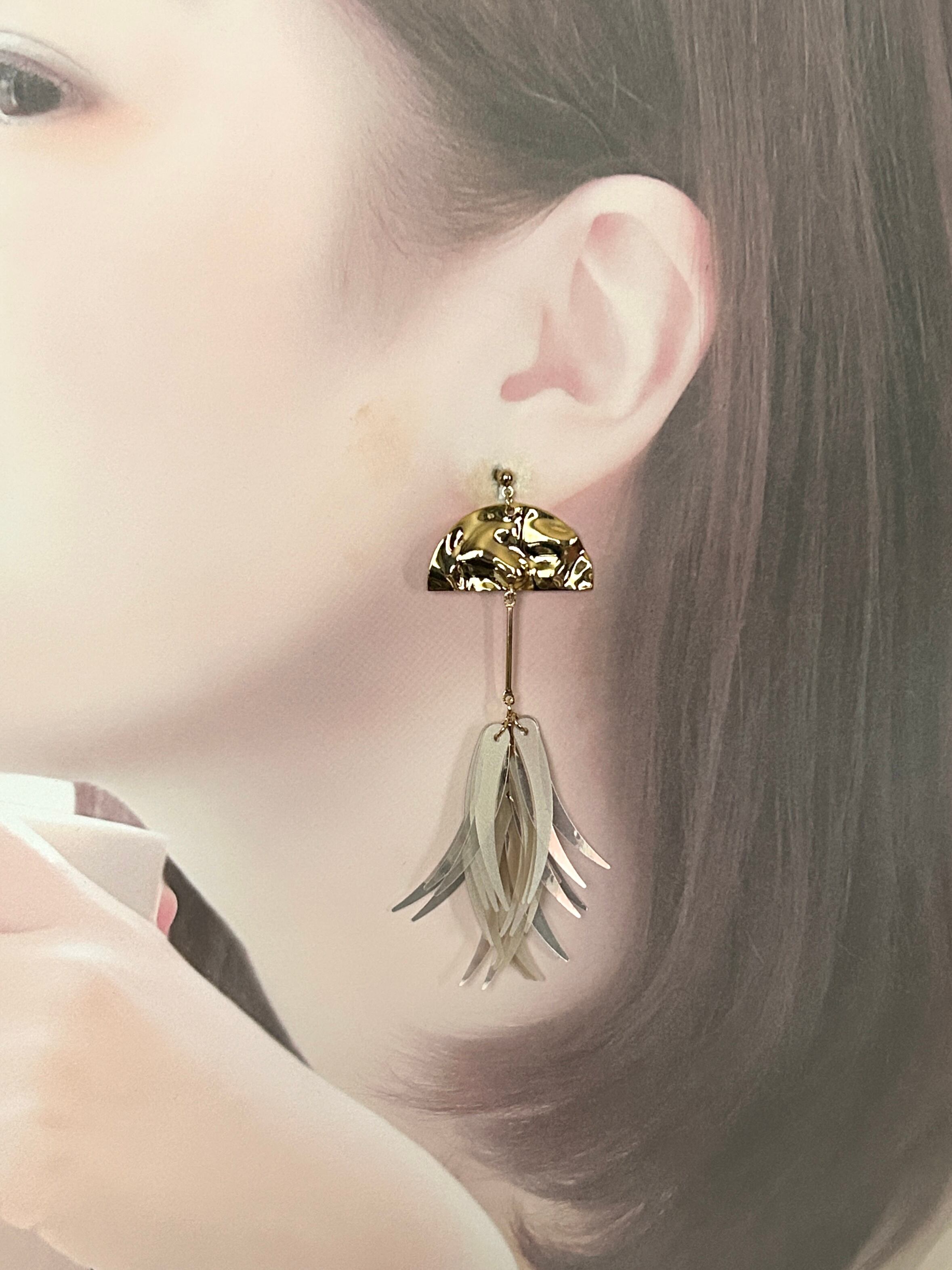 ゆらゆらスパンコールが可愛い、個性派デザインが映える大ぶりピアスです。
