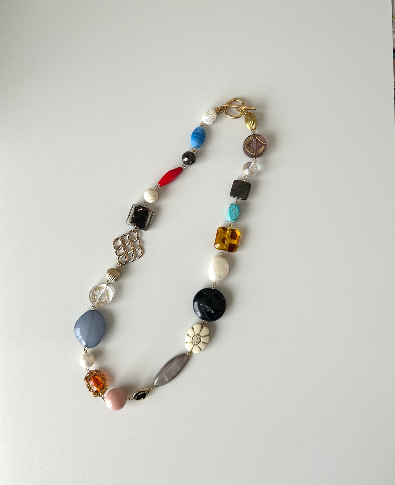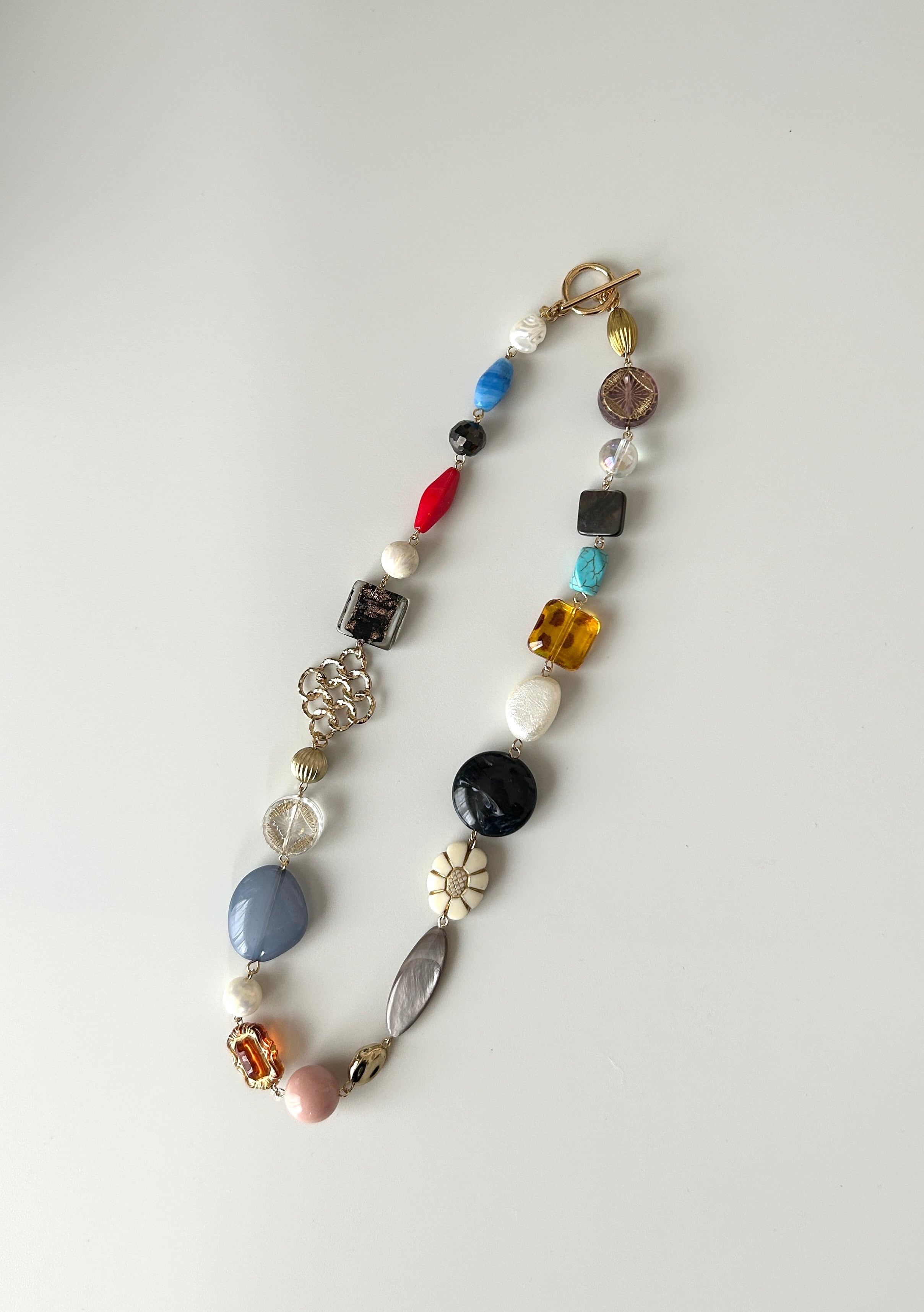 ドイツ製アクリルビーズやチェコビーズ等、様々なビーズを連ねた、シンプルコーデのアクセントにぴったりなシ個性派ネックレスです。