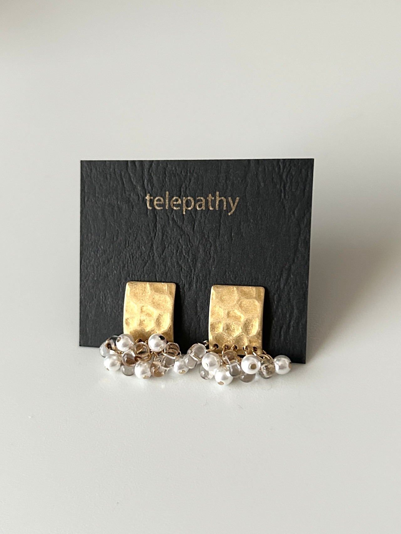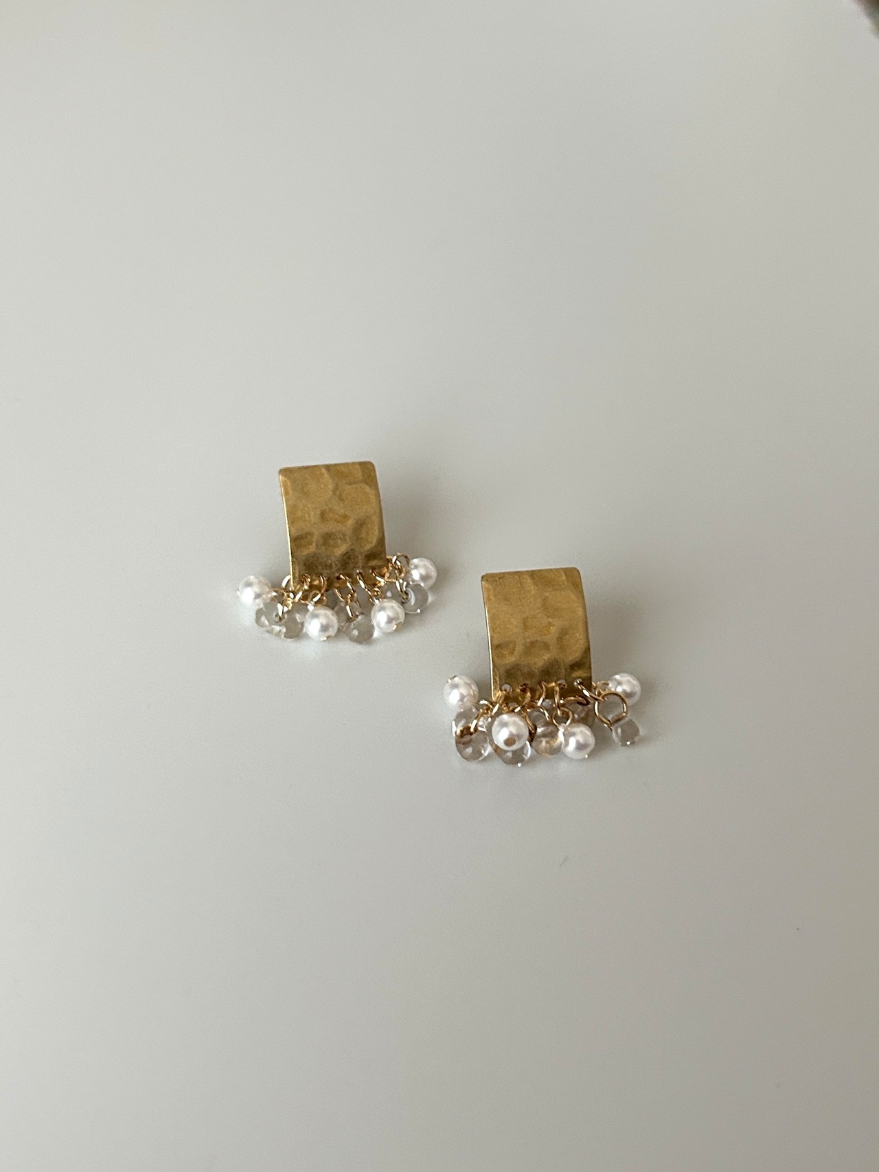 ほんのりカーブした、ハンマー加工の真鍮プレートに、パールとキラキラクリアチェコビーズを合わせた、デイリー使いにもぴったりな大人ピアスです。