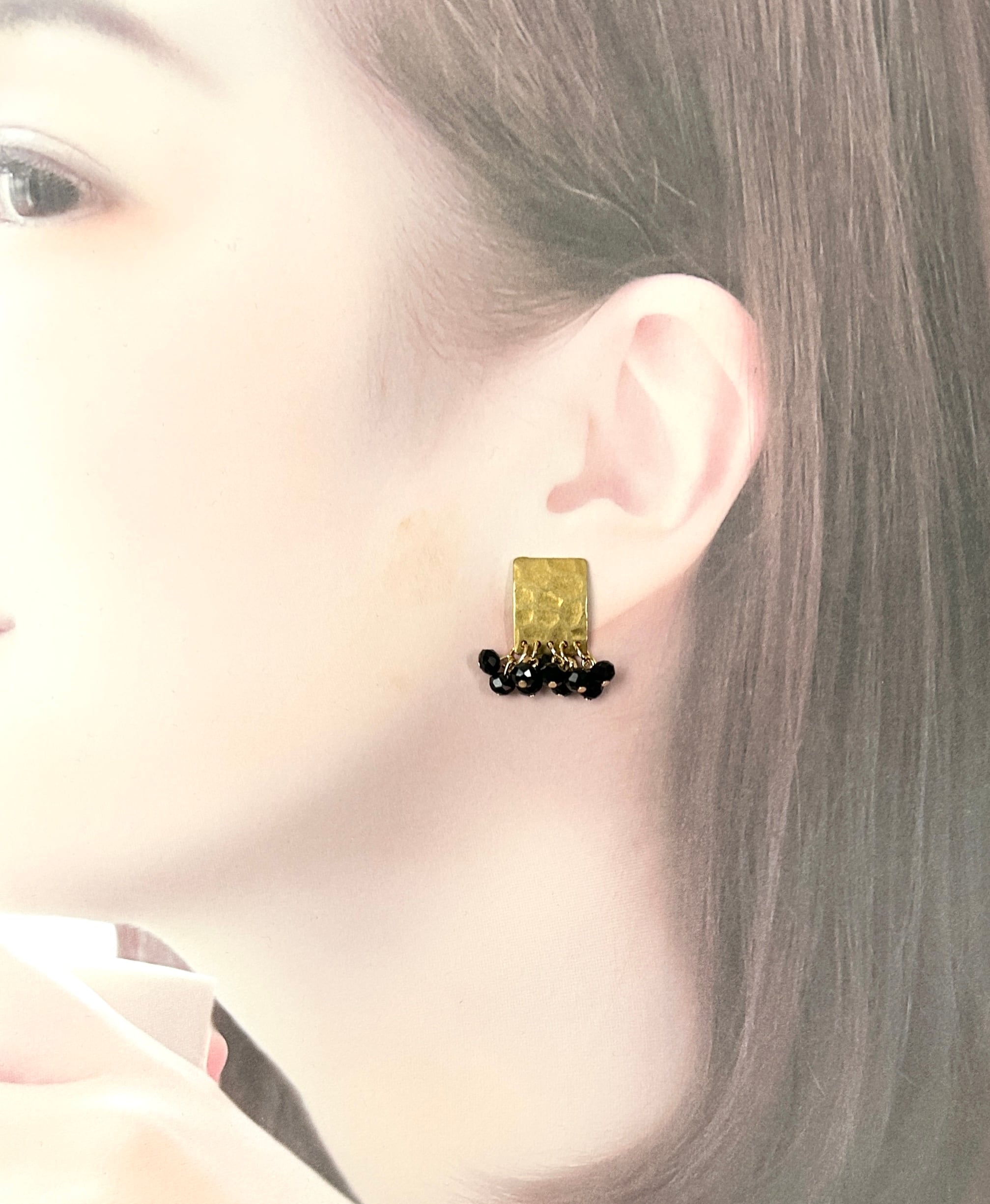 ほんのりカーブしたハンマー加工の真鍮プレートに、ブラックビーズを合わせた、かっこいい大人ピアスです。