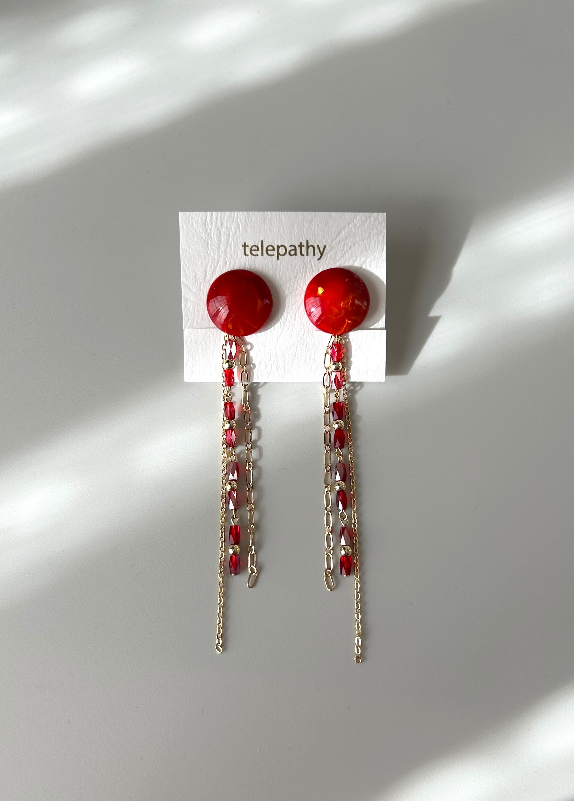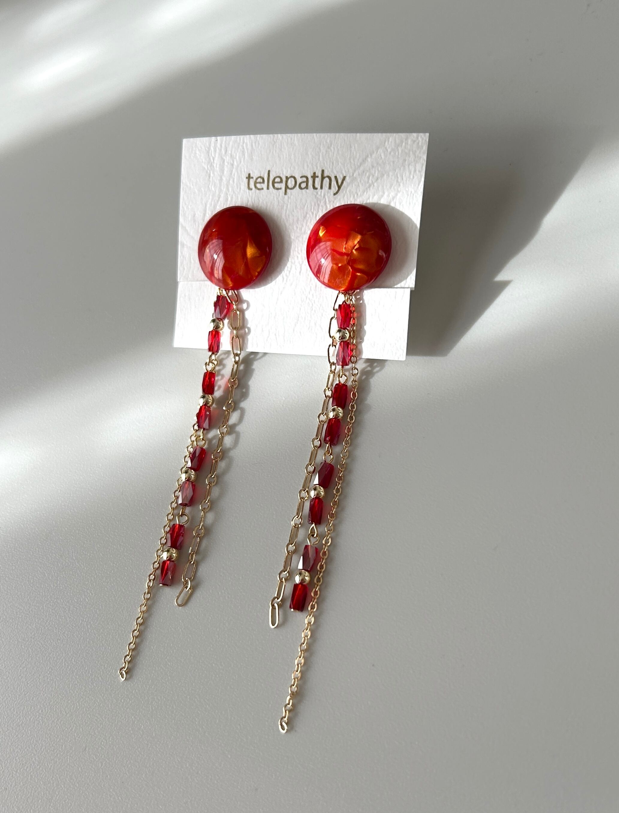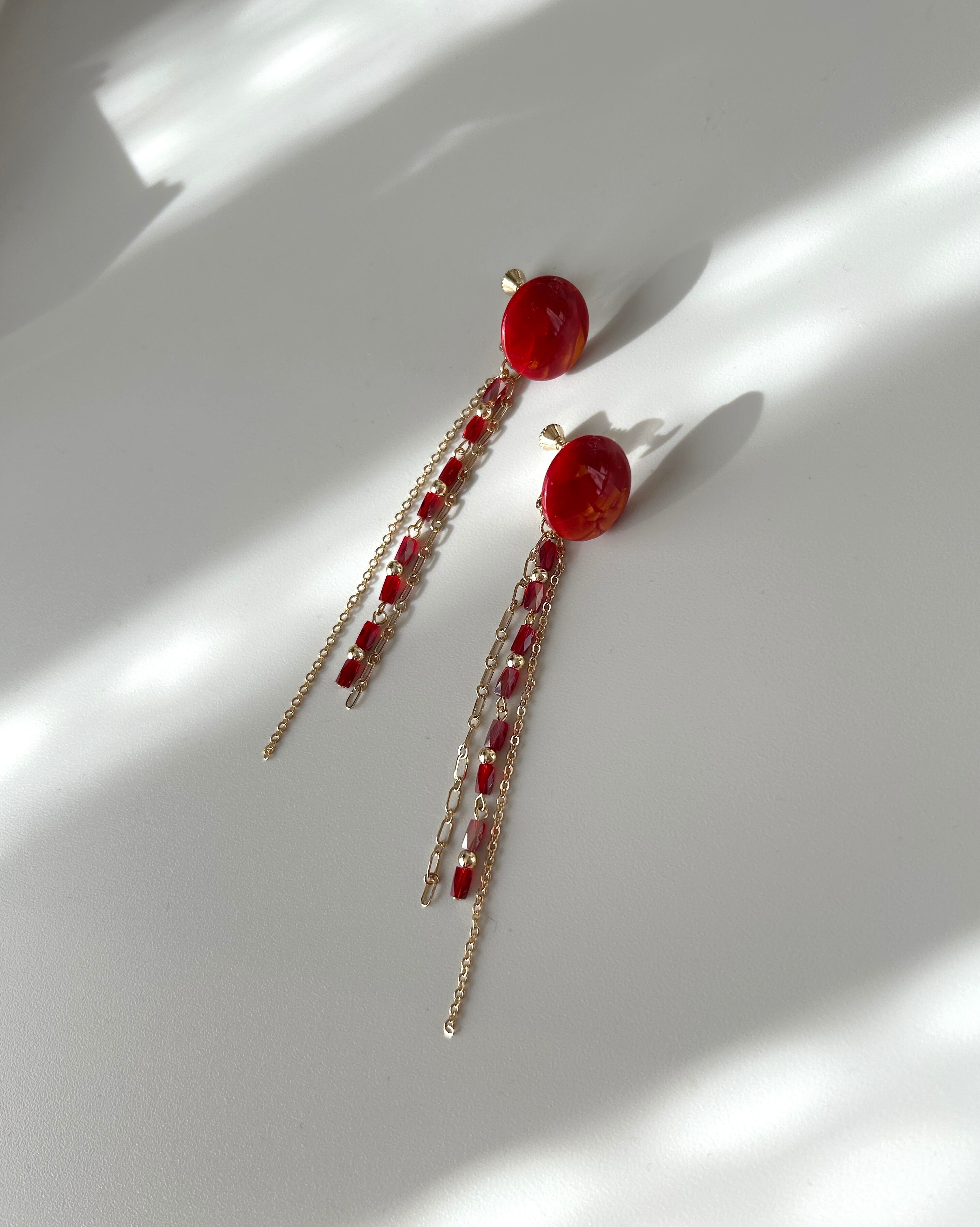 艶やかな赤マーブルのアセチカボション×2連のチェーン&ガラスビーズタッセル。