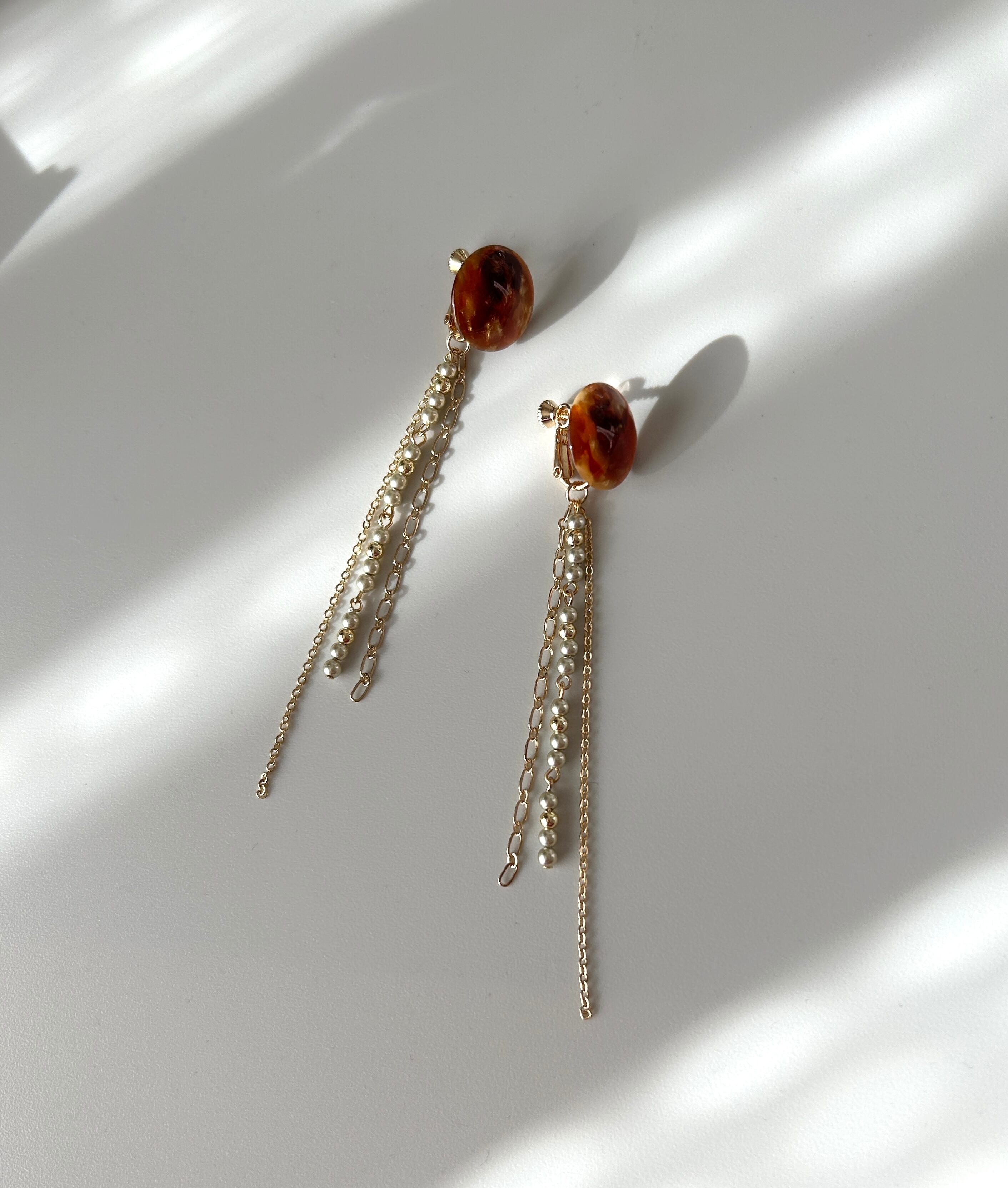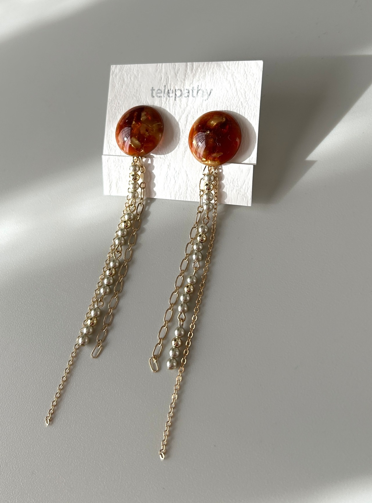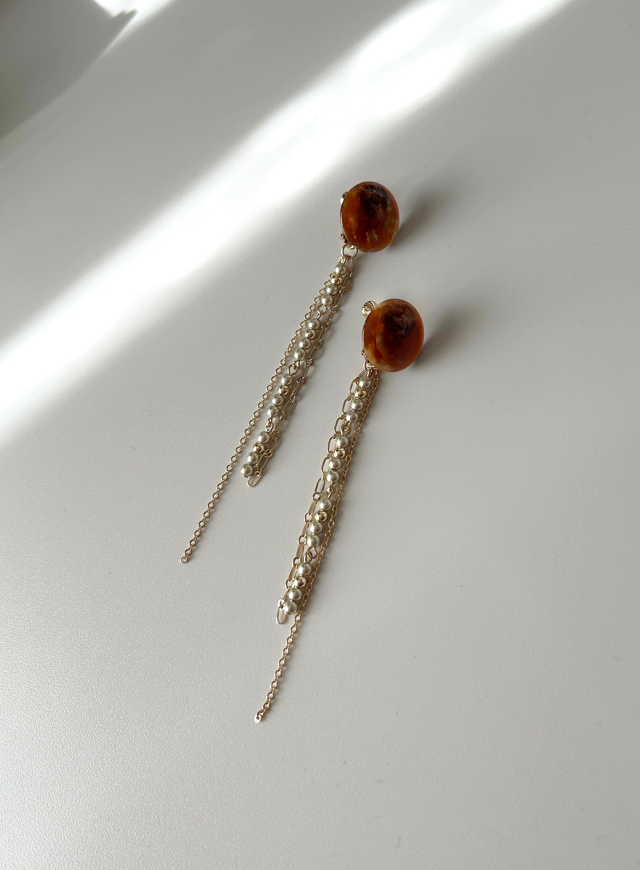 べっ甲カラーマーブルのアセチカボション×2連のチェーン&シャンパンゴールドパールタッセル。