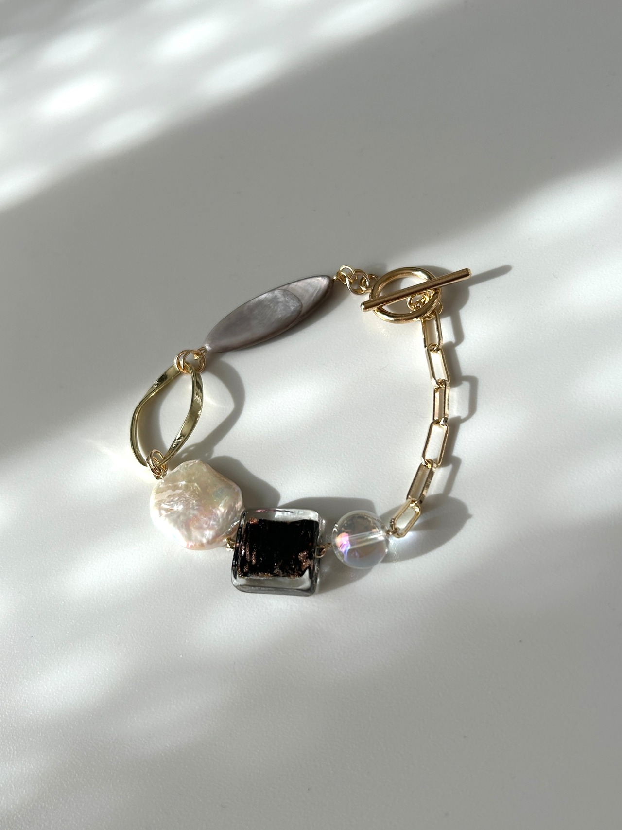 大粒淡水パール・シェル・ガラスビーズを組み合わせ、ほんのりリッチな落ち着いた雰囲気に仕上げました。