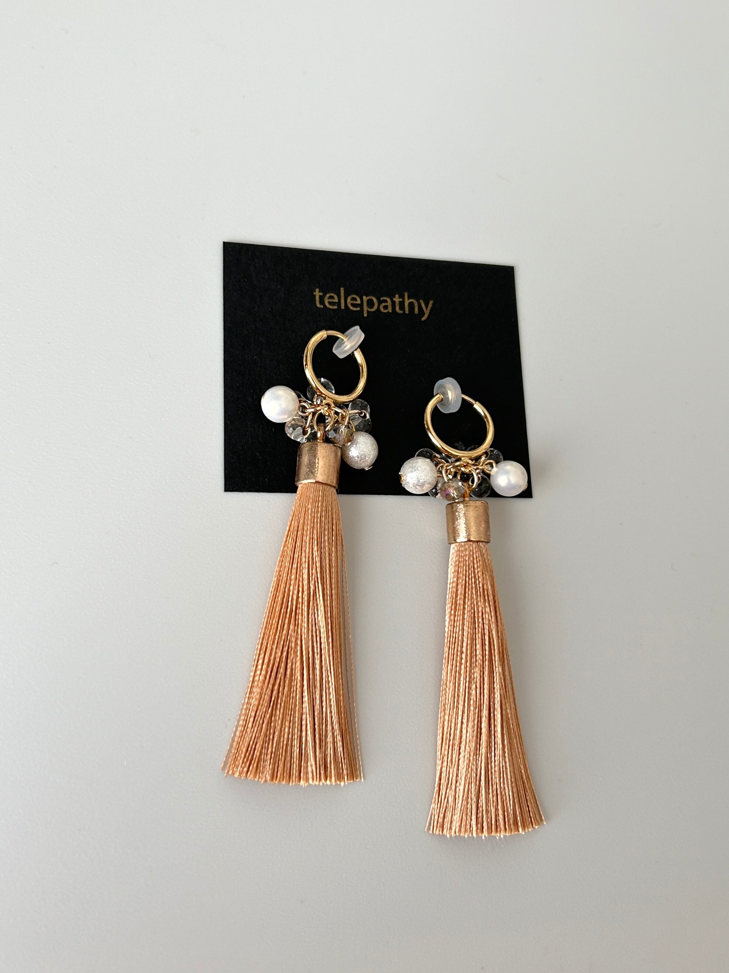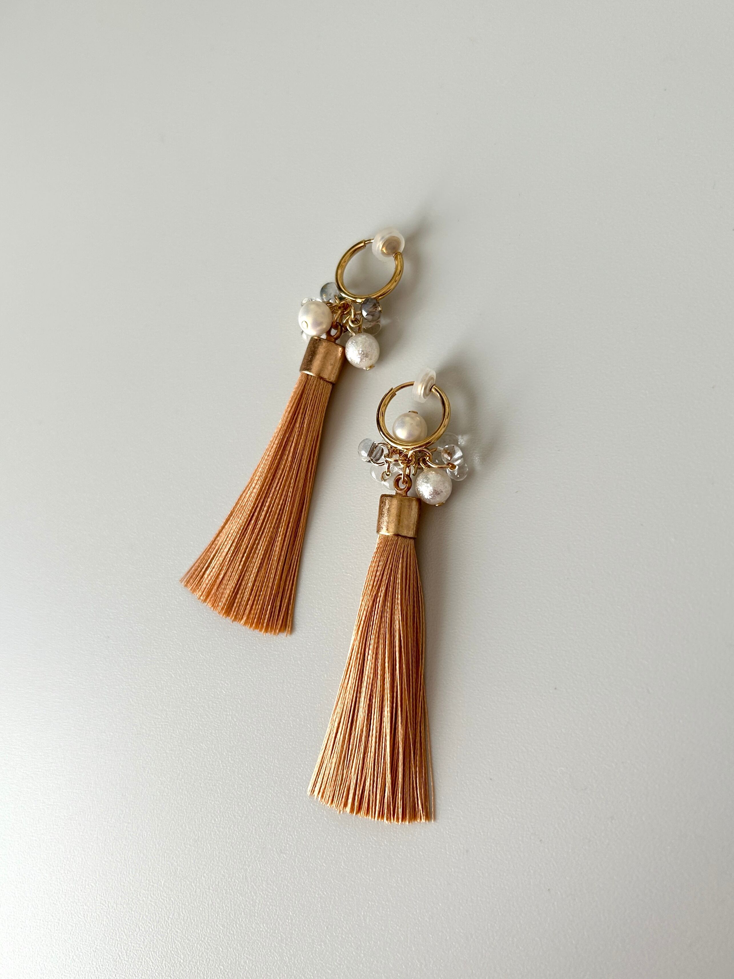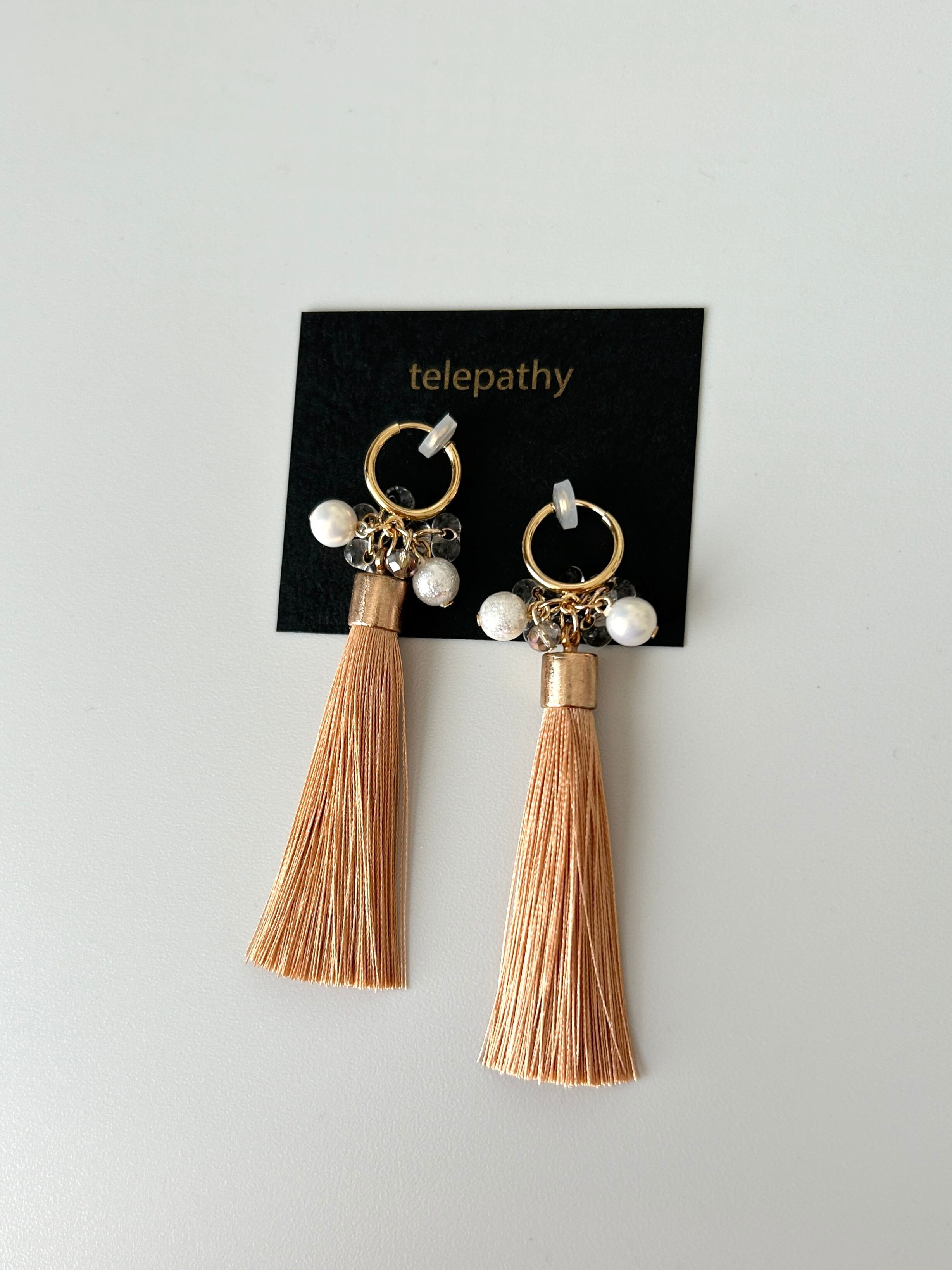 肌馴染みな良いベージュタッセルに、パールやガラスビーズを合わせました。