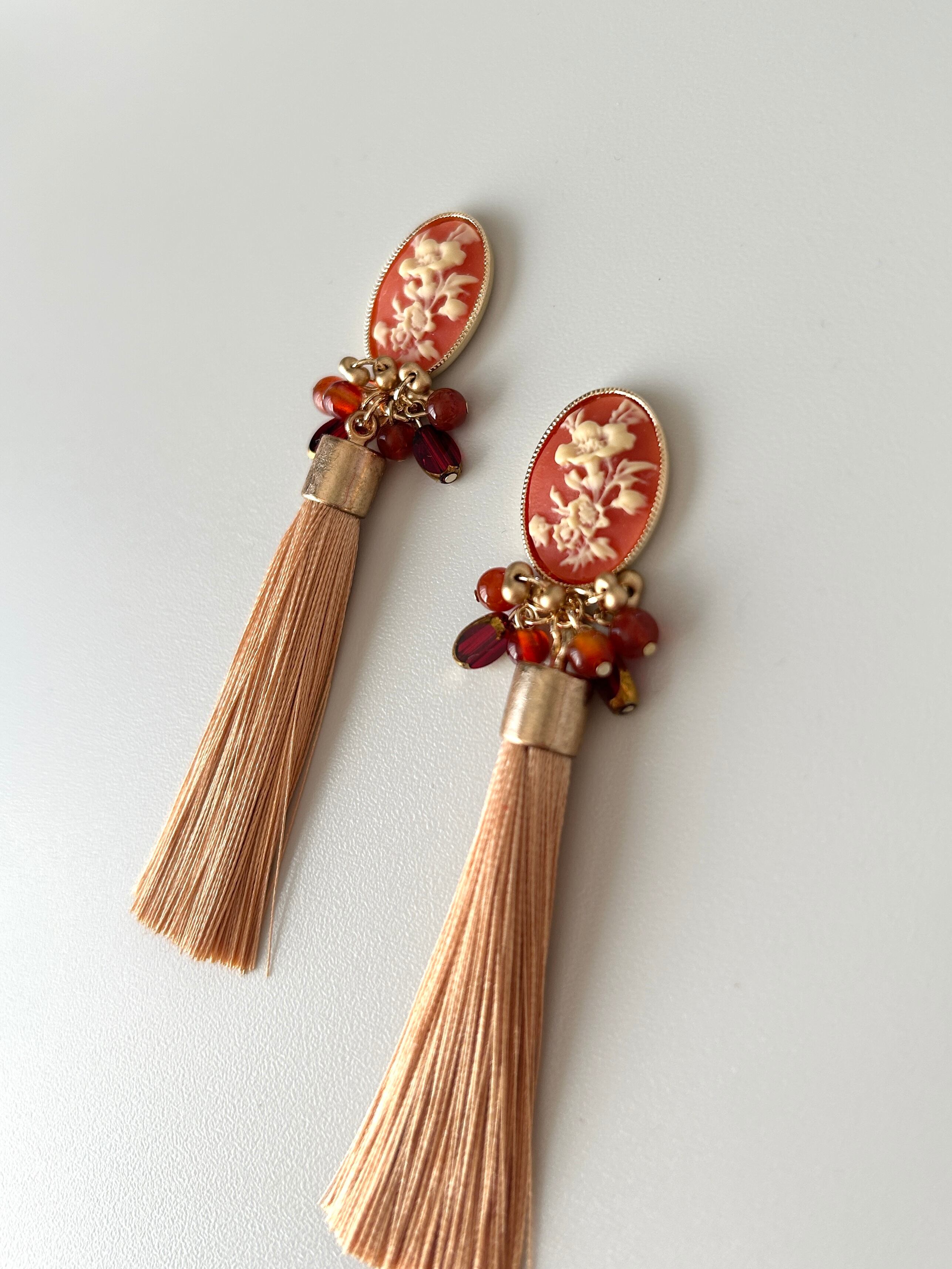 フラワーカメオ×タッセル ピアス/イヤリング オレンジ