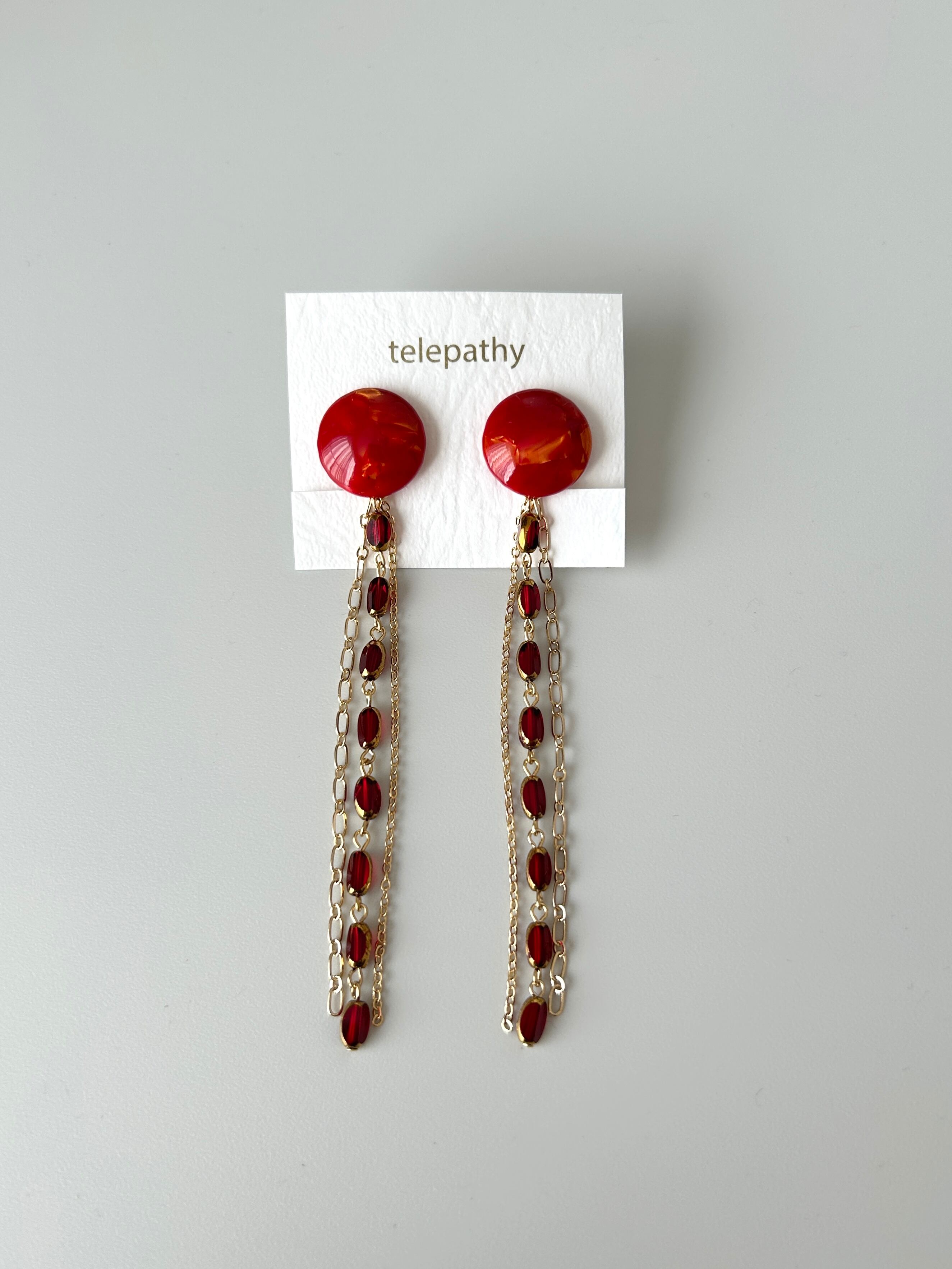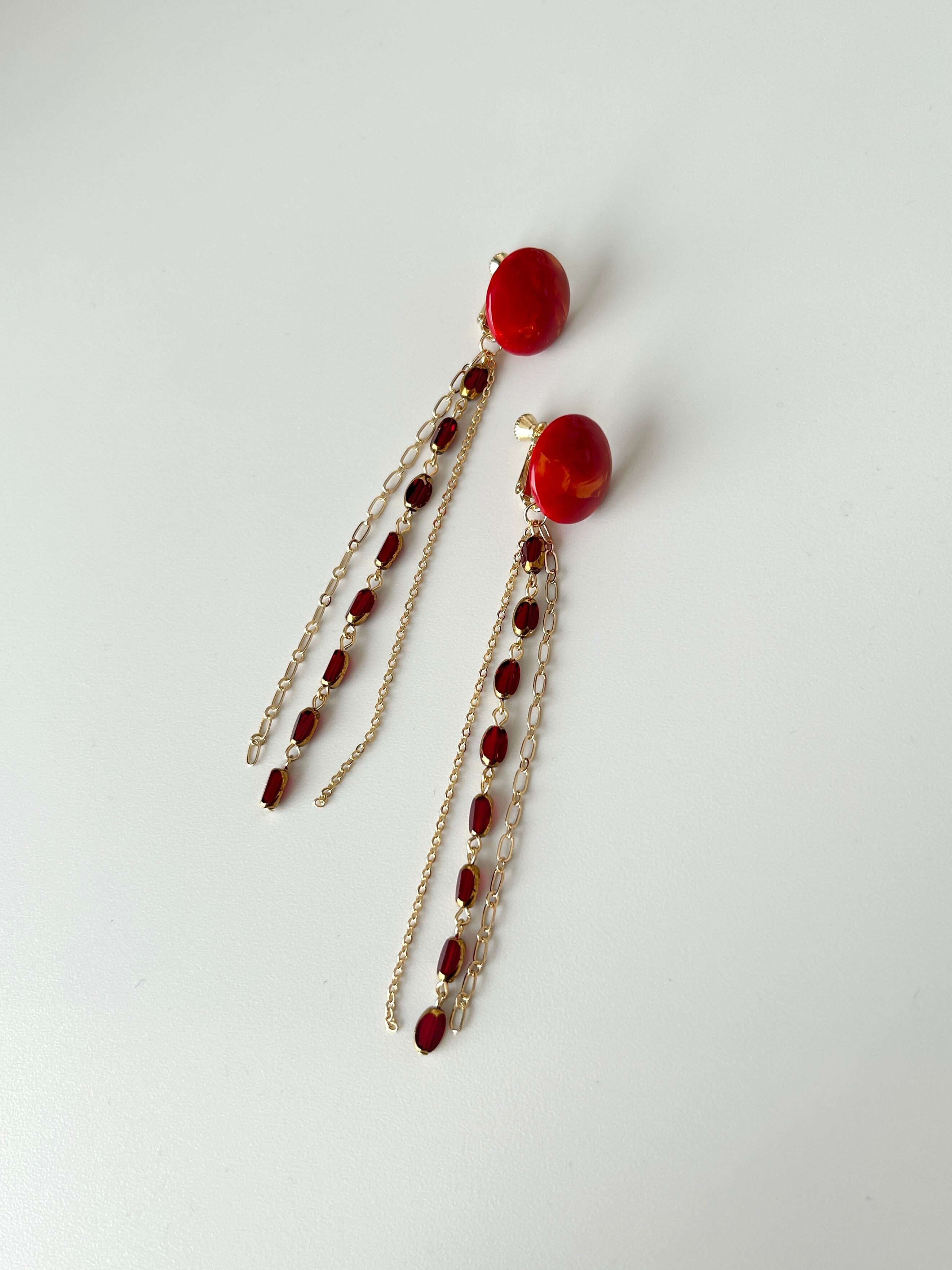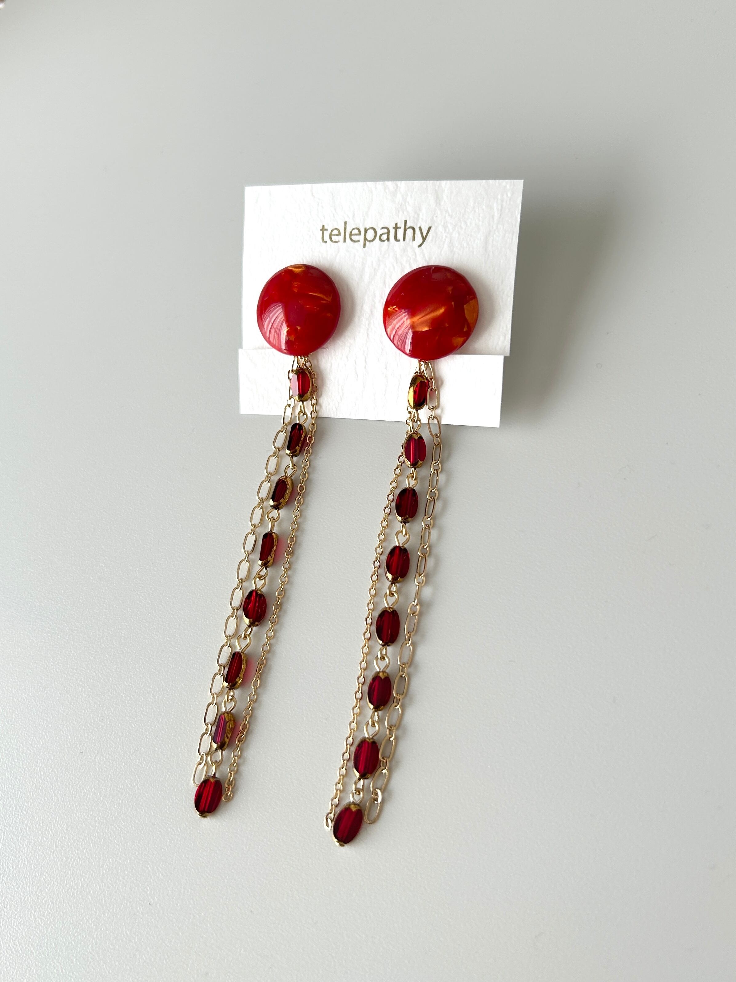 艶やかな赤マーブルのアセチカボション×2種のチェーン&ガラスビーズタッセル。