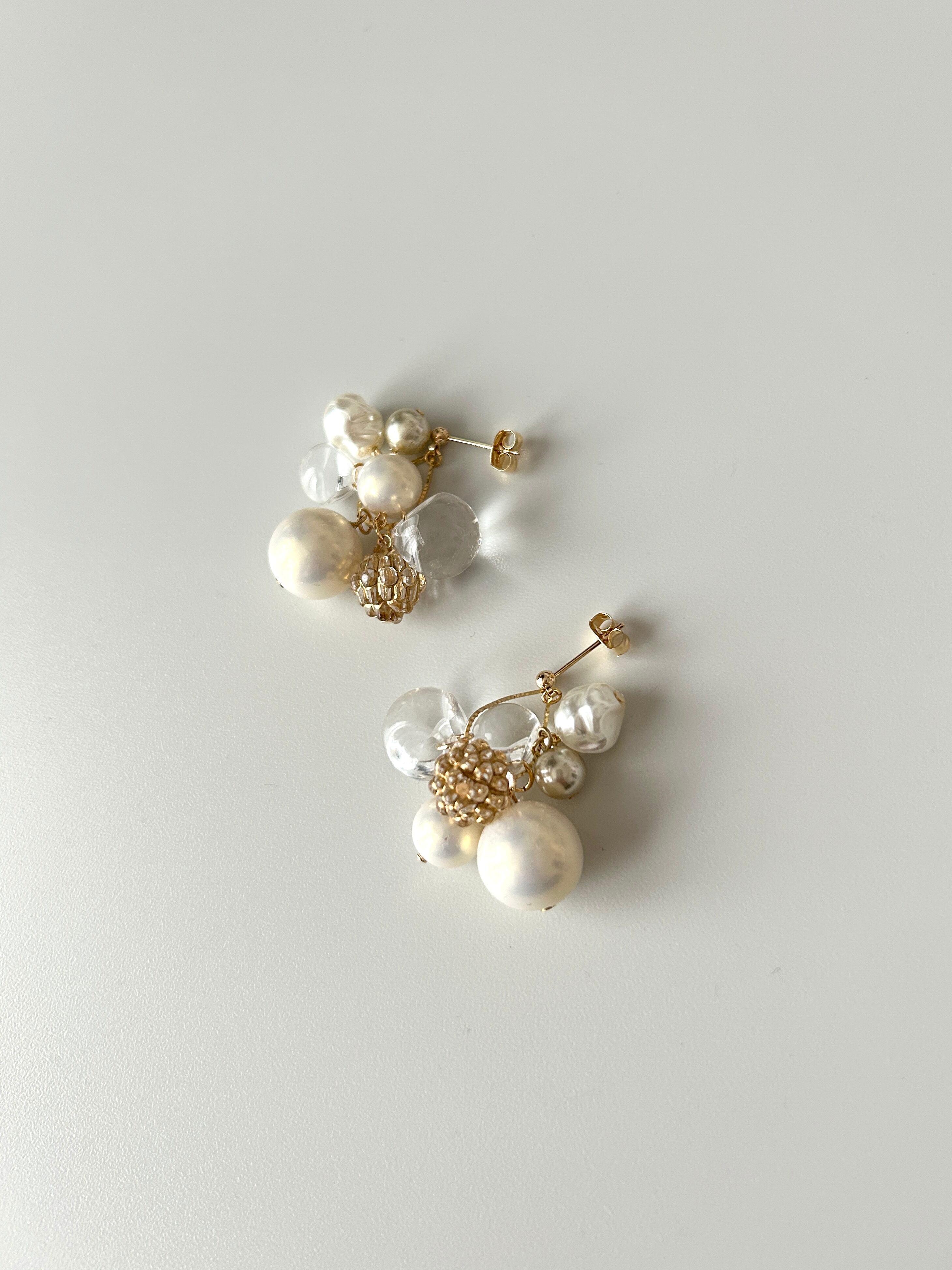 様々なパールとクリアビーズを合わせた、ゴロゴロボリュームが可愛いピアスです。