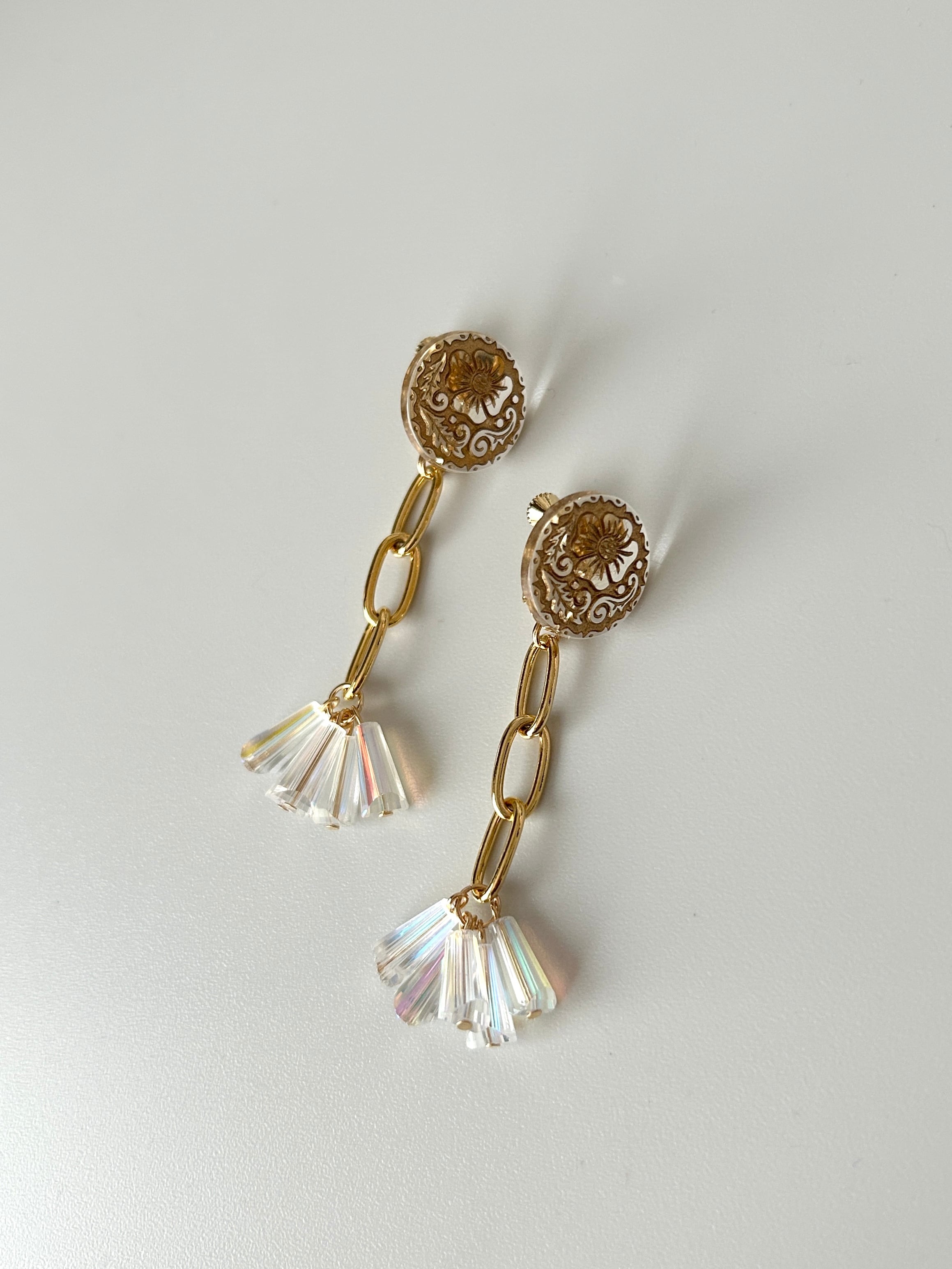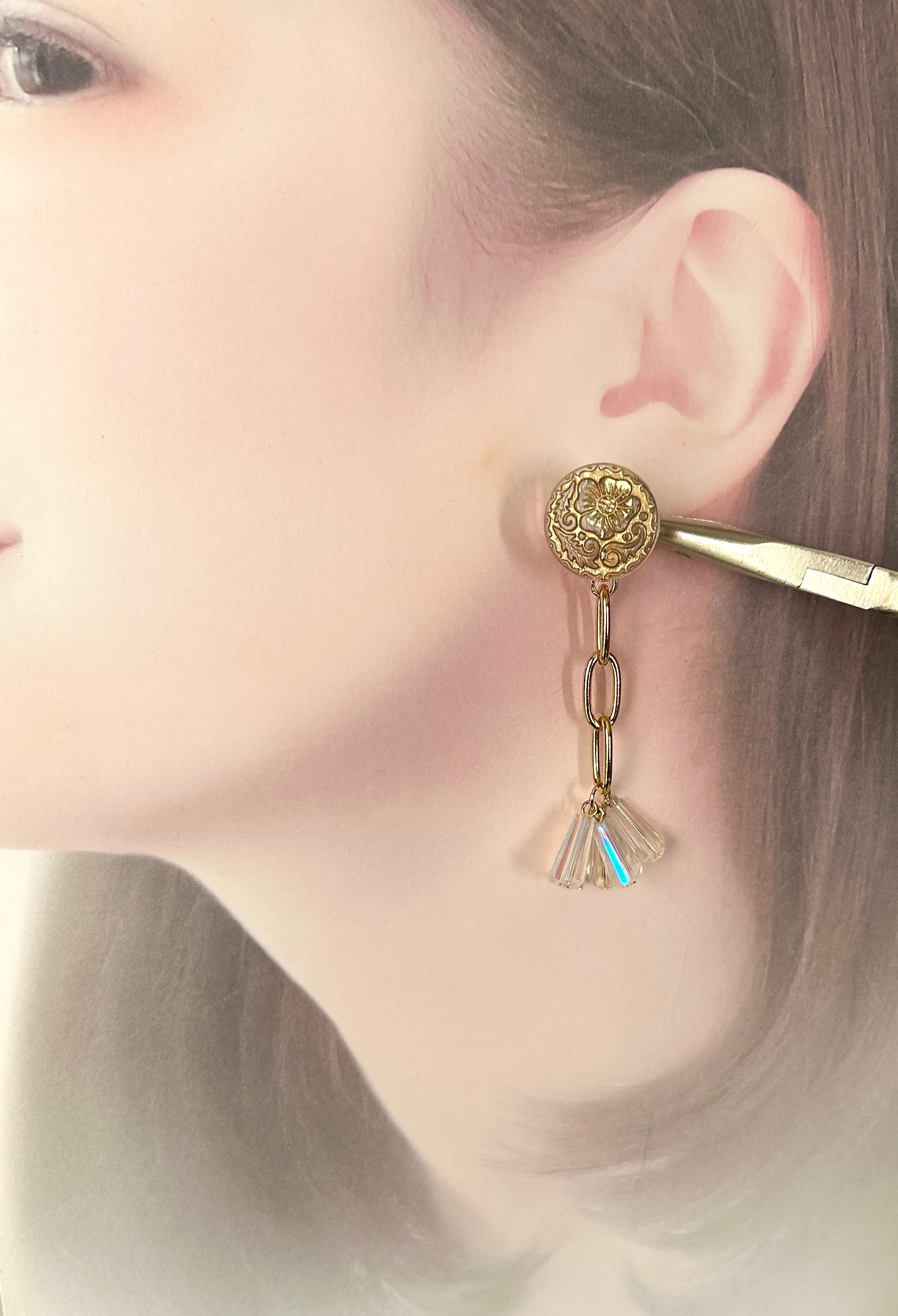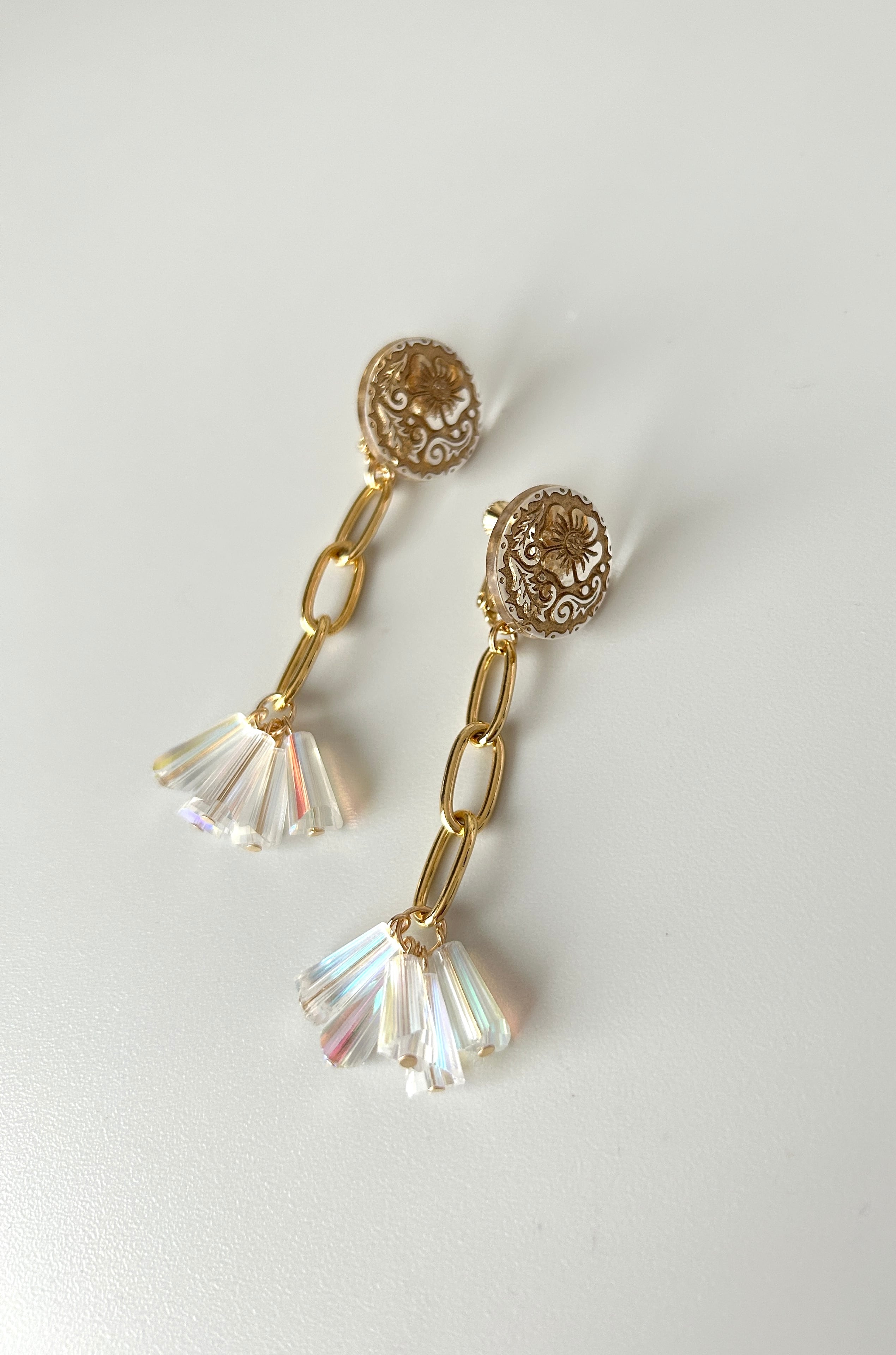 アンティーク感漂うドイツ製アクリルカボション(クリア×ゴールド)に、クリアタワービーズを合わせました。
