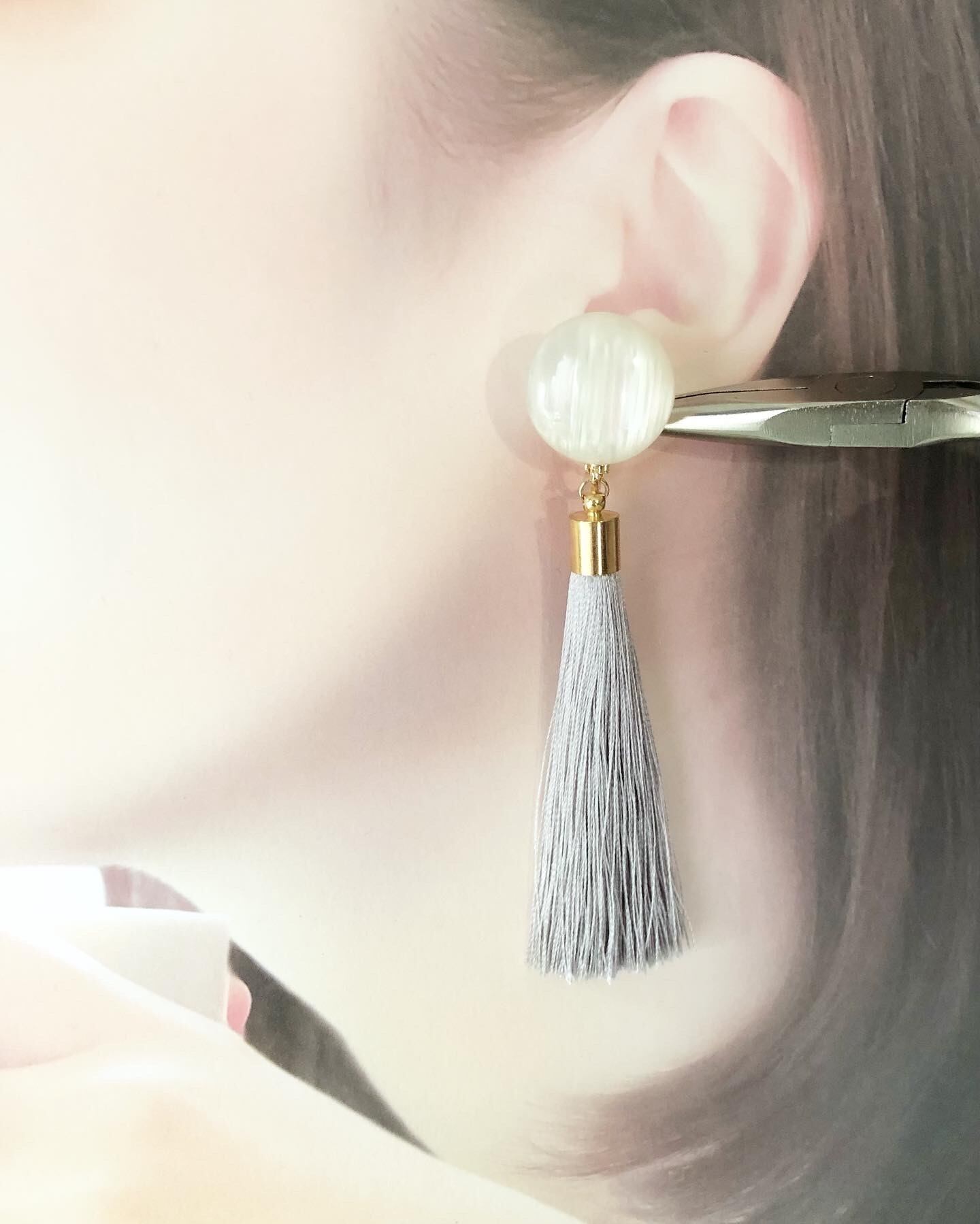 シェル風アクリルカボションに、ライトグレーのシルクサテンタッセルを合わせた、見た目も軽やかなイヤリングです。
