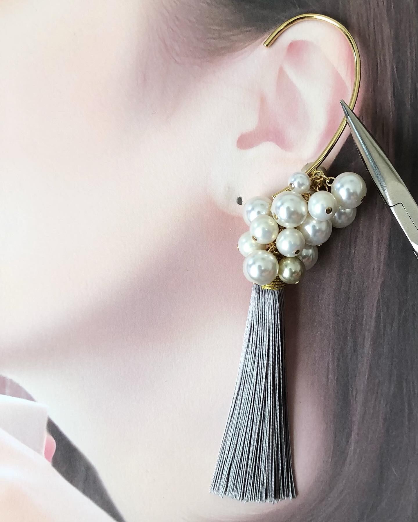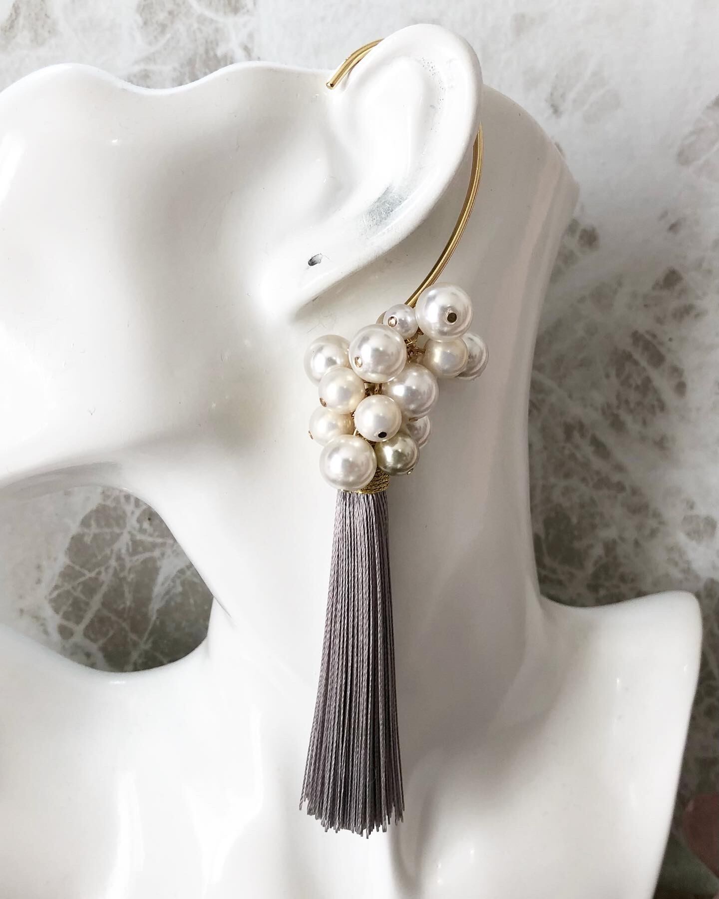 存在感のあるグレータッセルに、ジャラジャラパールが可愛い、コーデのアクセントにぴったりなイヤーフックです。