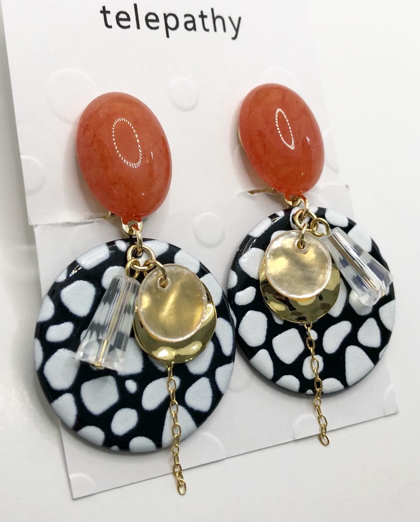 オレンジの天然石カボションに、モノトーンパーツがレトロな、存在感のあるイヤリングです。