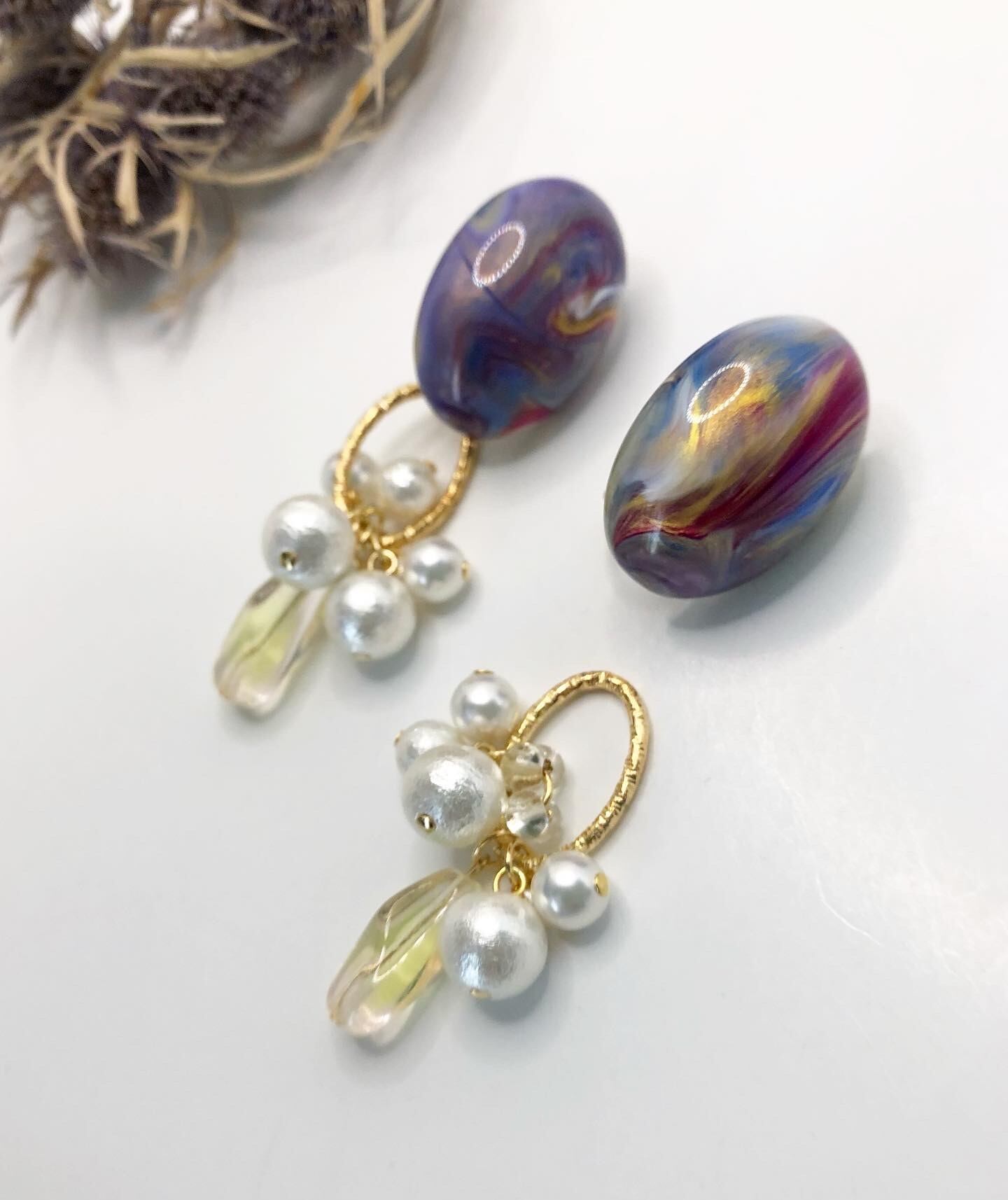印象的なドイツ製アクリルカボションに、ジャラジャラを合わせた、存在感のある2wayイヤリングです。