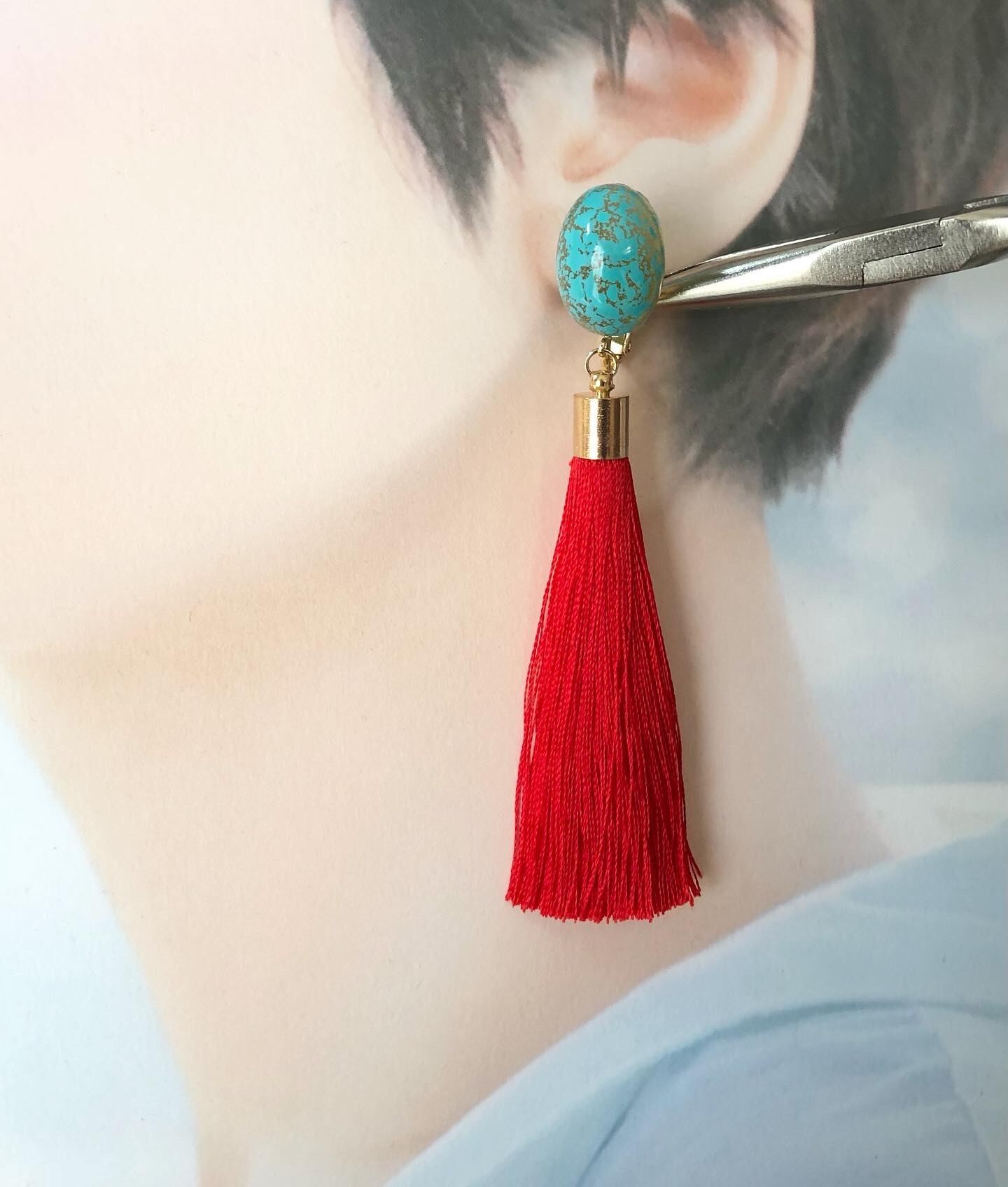 ターコイズカラー×赤、コーデのアクセントぴったりな、気分の上がるイヤリングです。