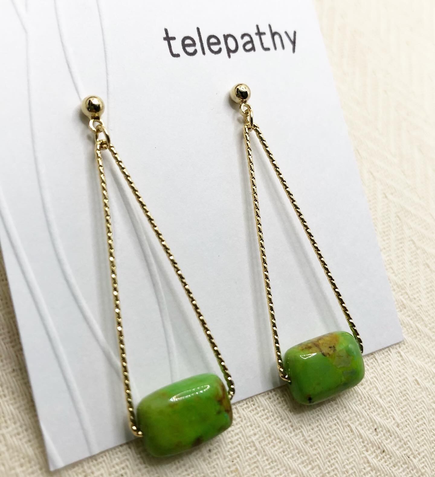 高品質グリーンターコイズの、綺麗目コーデにもよく合うトライアングルピアスです。