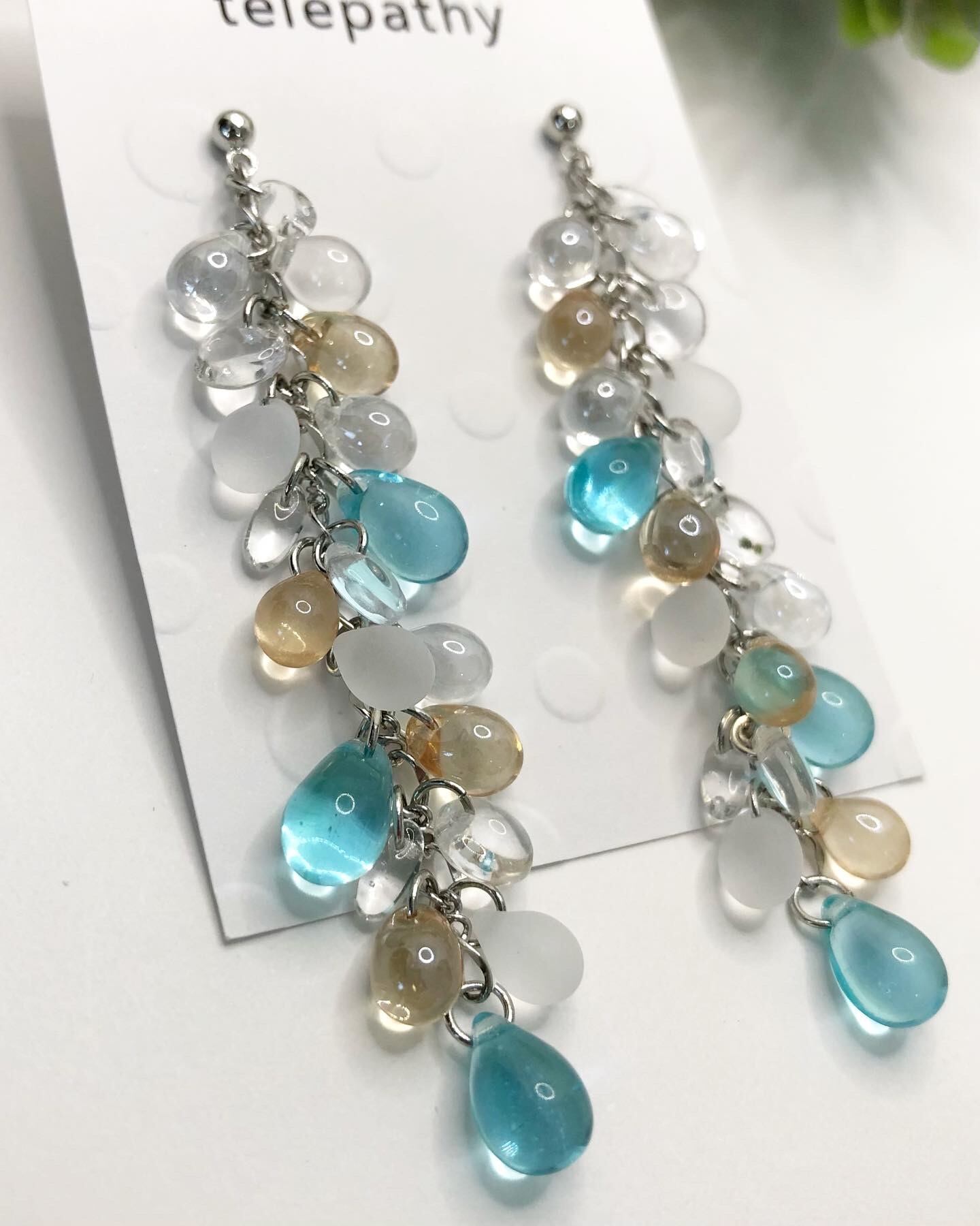 雫型チェコビーズが素敵に揺れる、涼しげなピアスです。