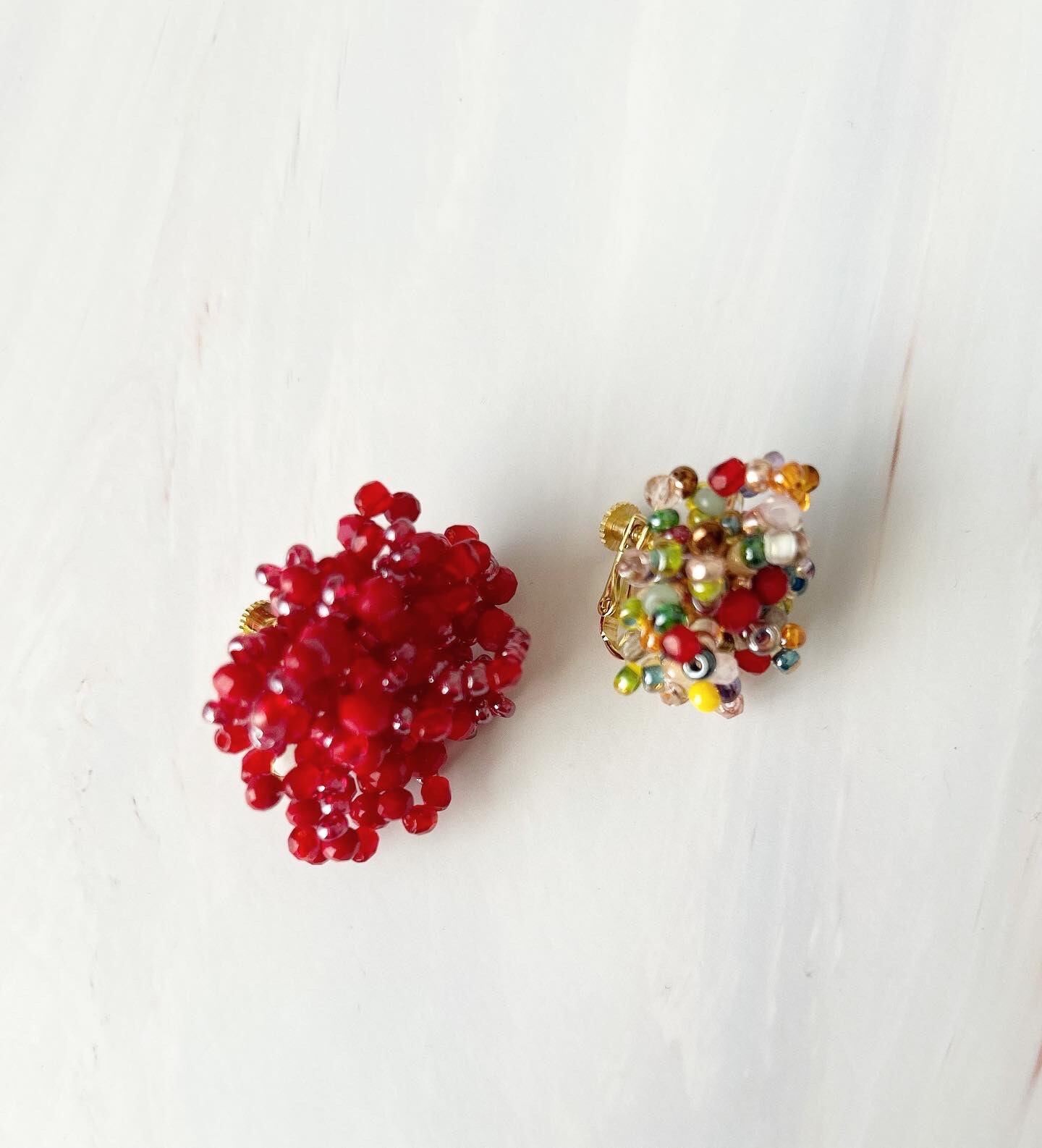 カラフルビーズを立体に編んだ、コーデのアクセントにぴったりなアシンメトリーイヤリングです。