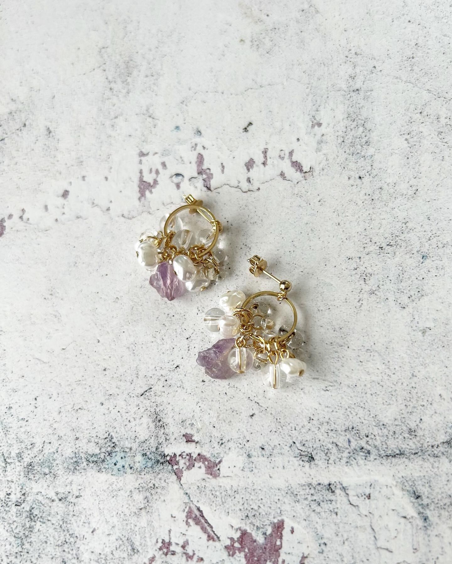 ラフカットアメジストにクリア(チェコビーズ、アクリル、変形パール)を合わせた、耳元潤う大人ピアスです。