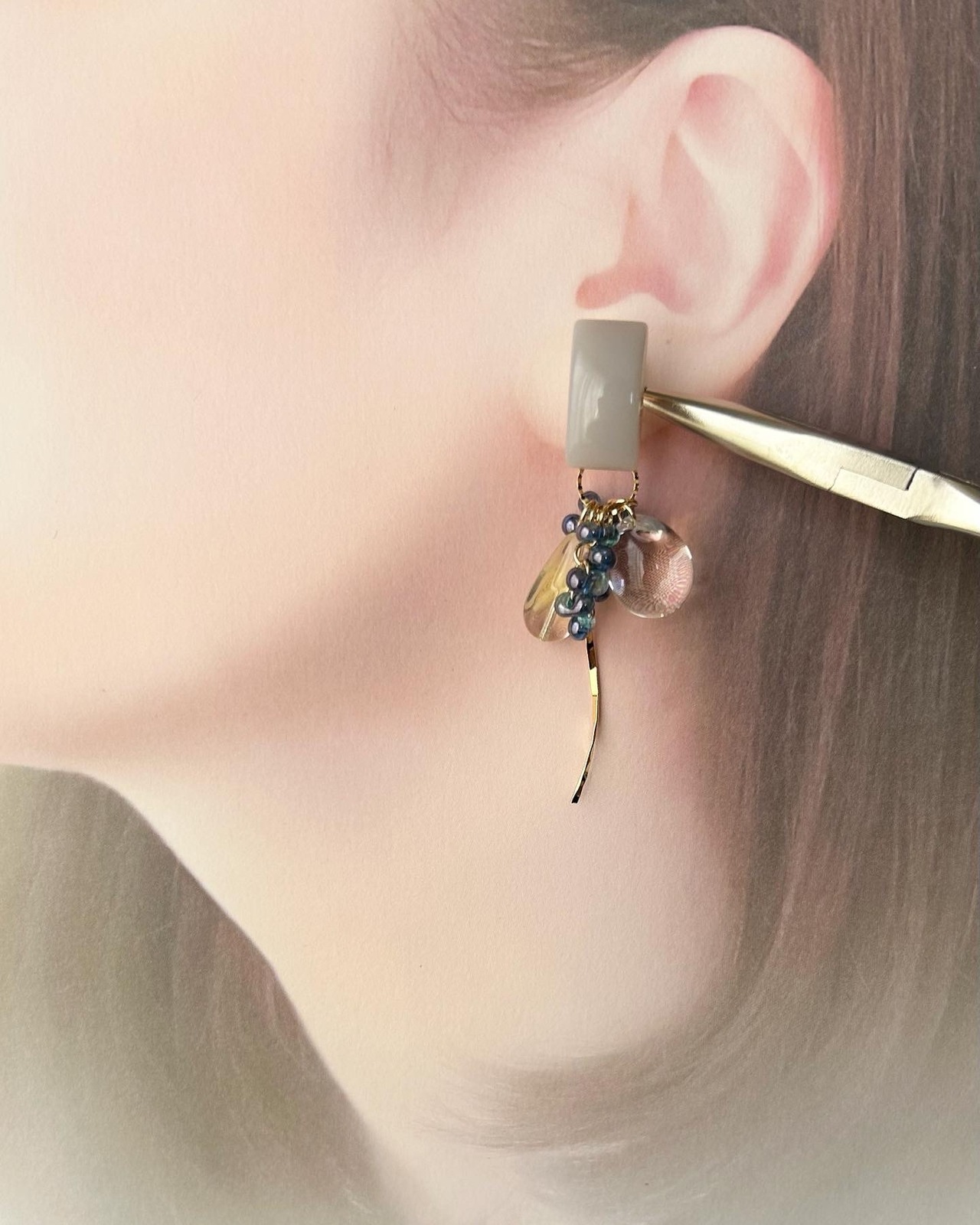 グレージュのドイツ製アクリルカボションに、チェコビーズやクリア雫を合わせた、個性派デザインが可愛い大人イヤリングです。