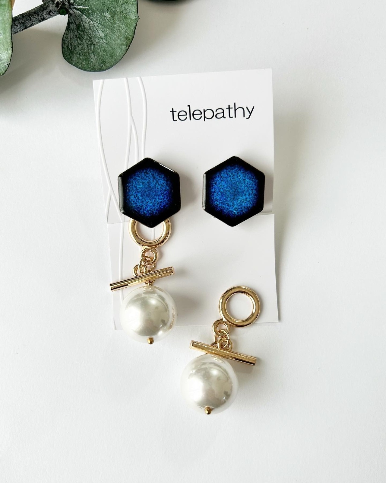 深いブルーが綺麗な六角形美濃焼きタイル×大粒樹脂パール(18mm)、綺麗めスタイルにも合う大人2wayイヤリングです。