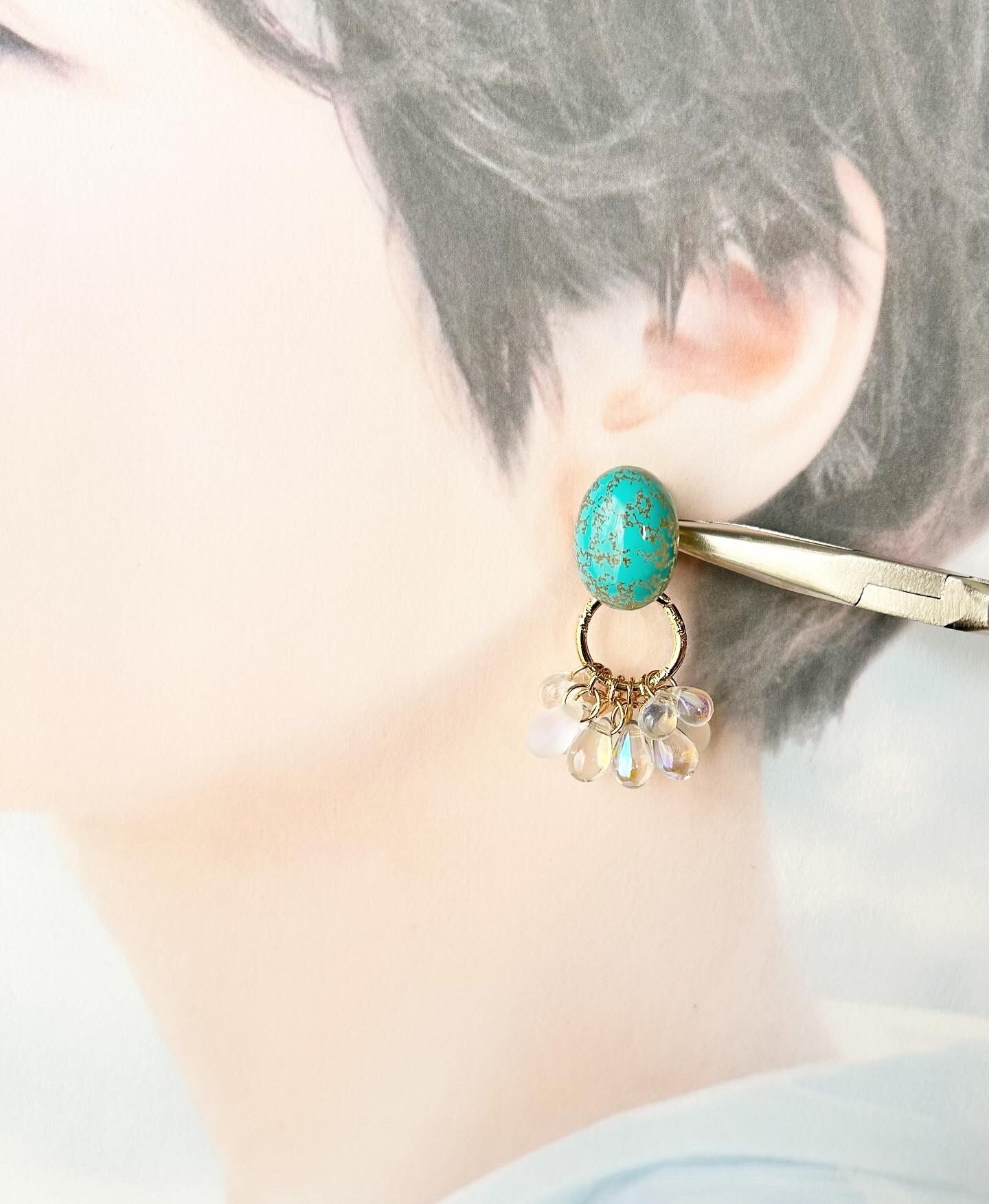 ターコイズカラーのvintageカボション×雫チェコビーズ。