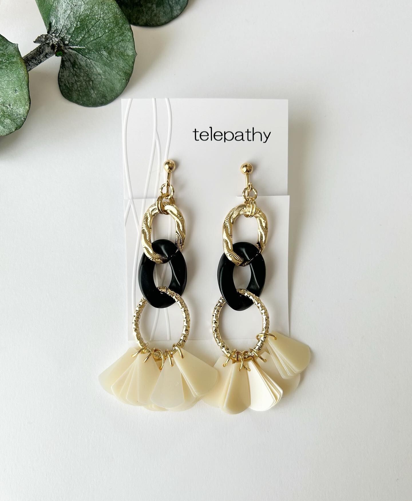 異素材チェーンにマットアイボリーのスパンコールの、モノトーン大ぶりイヤリングです。