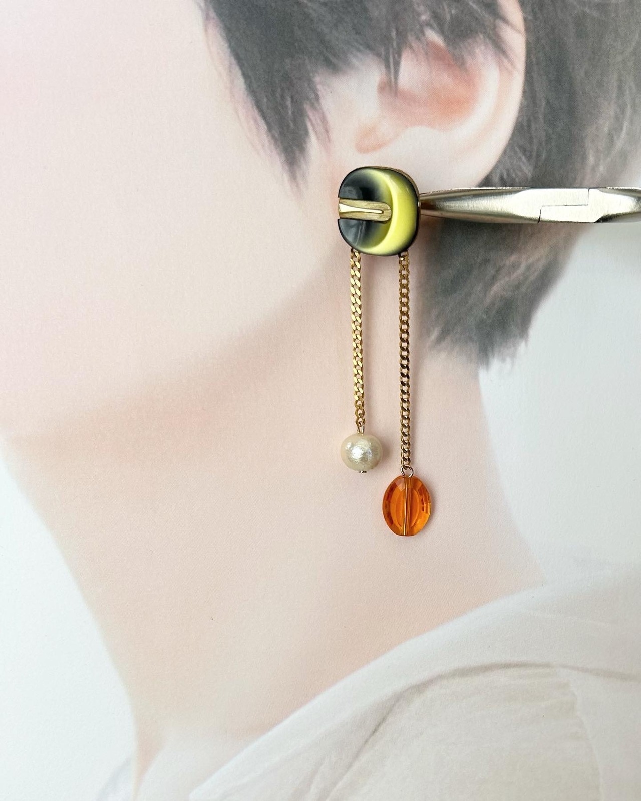 No.011 グリーン×オレンジ アシンメトリーイヤリング