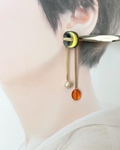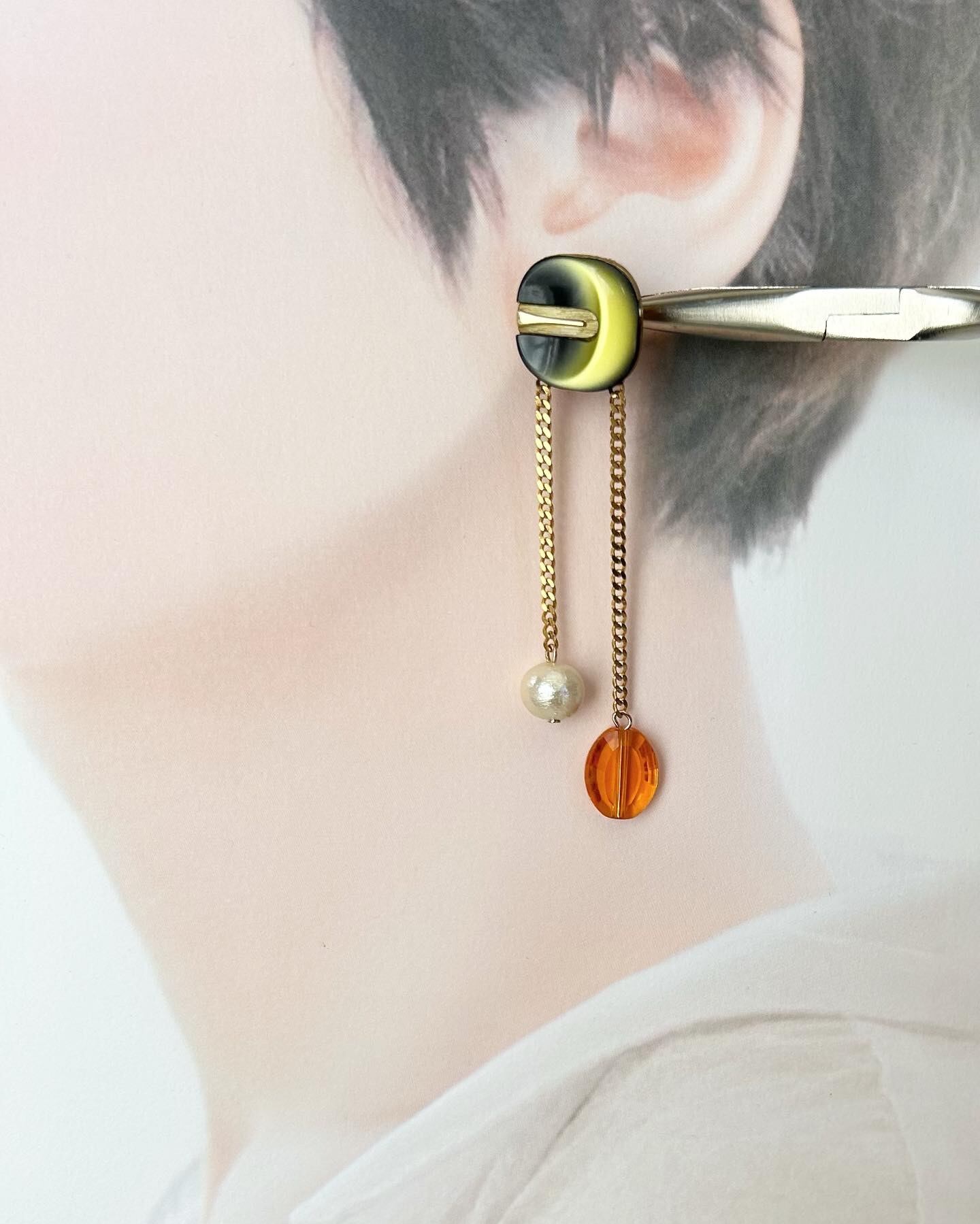 ジャパンヴィンテージボタンを加工し、カットが綺麗なガラスビーズとコットンパールに合わせた、個性派デザインのアシンメトリーイヤリングです。