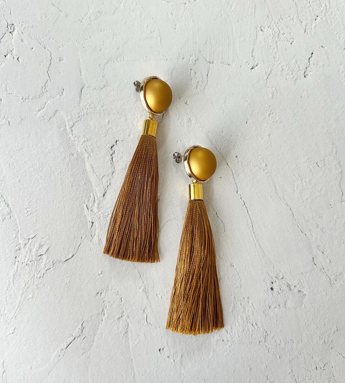 ゴールド系でまとめた、秋の装いにぴったりな大人タッセルピアスです。