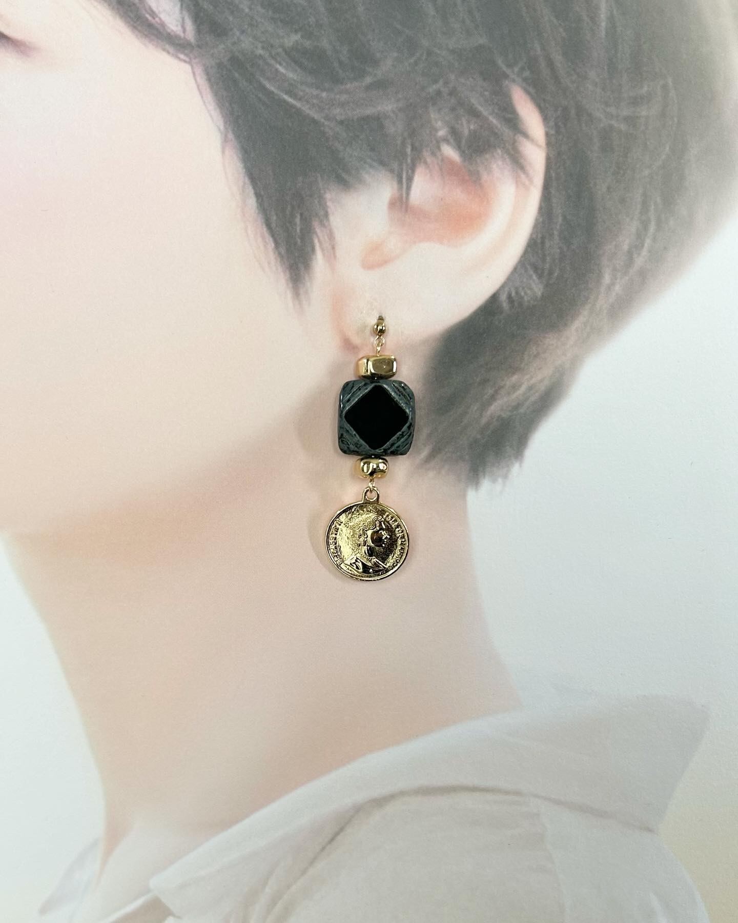 スクエア型ブラックチェコビーズ×ゴールドがかっこいい、アシンメトリーピアスです。