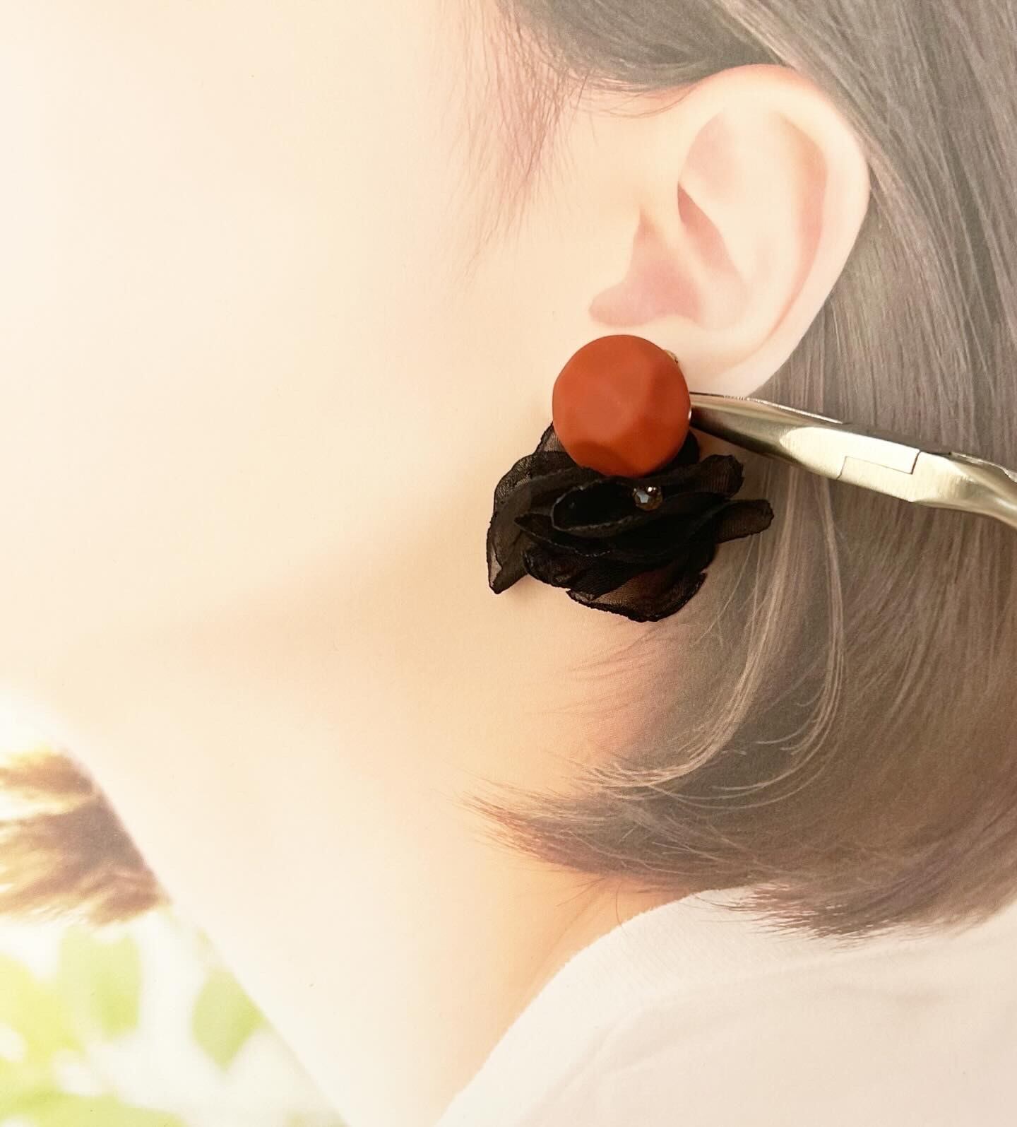 テラコッタカラーカボションにブラックシフォンフラワーを合わせた、コーデを大人っぽく仕上げるジューシーイヤリングです。